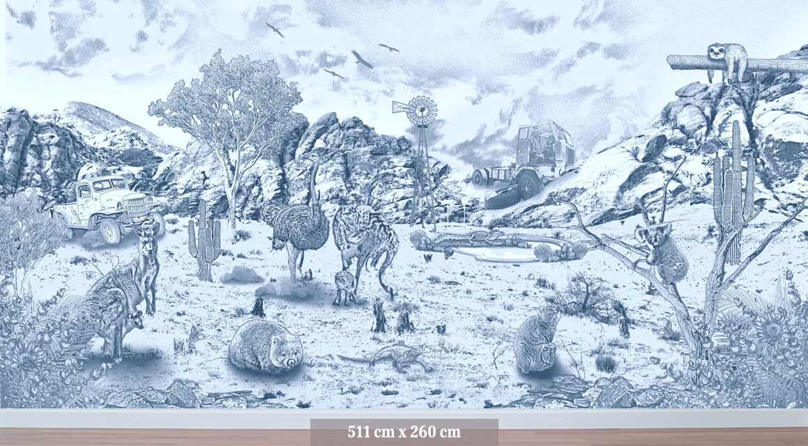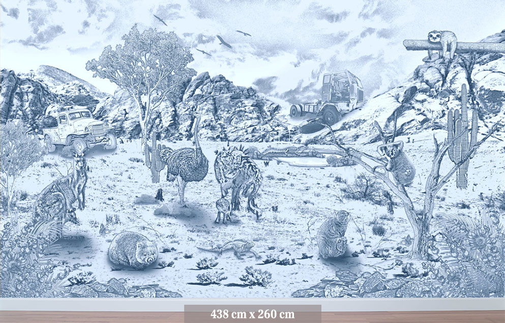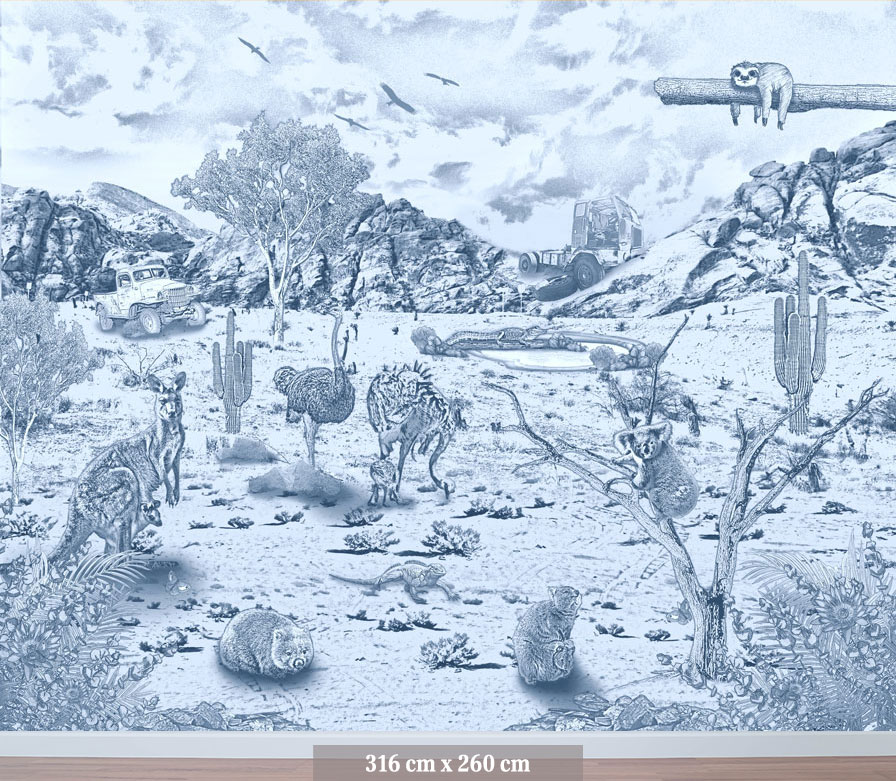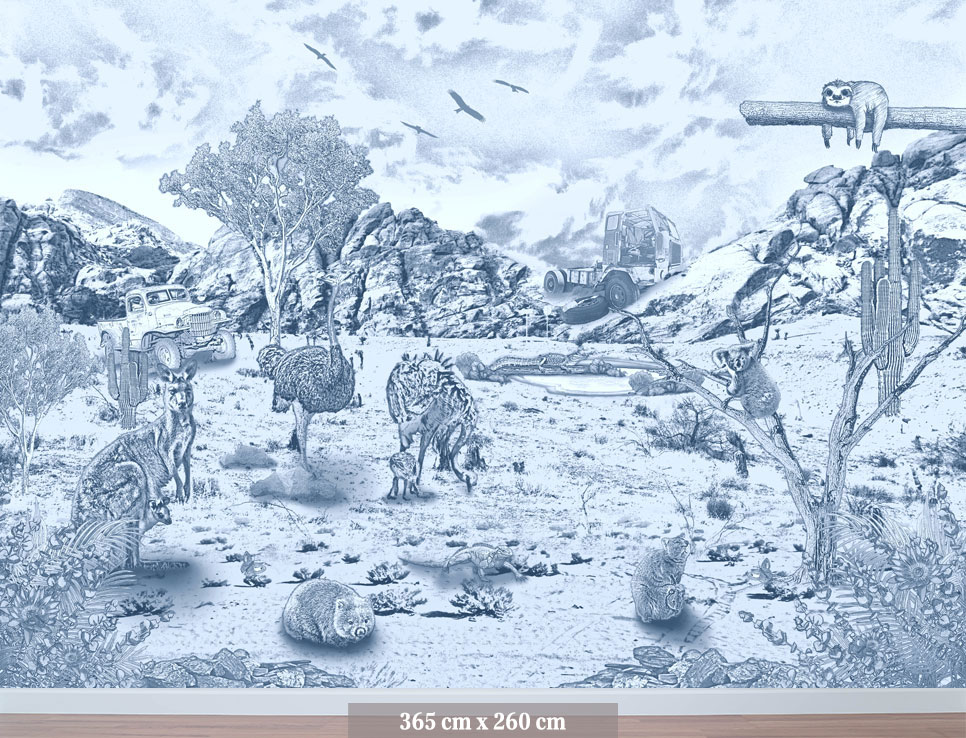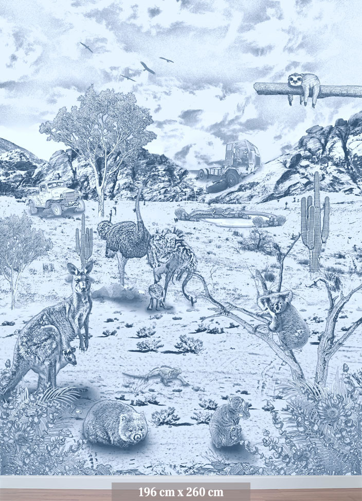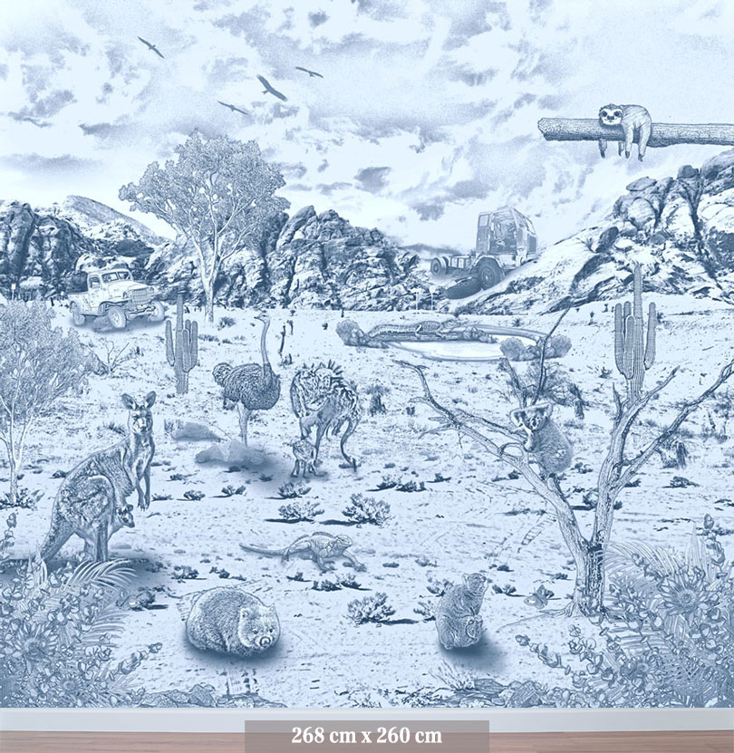 Diep in het hart van Australië leven dieren die je nergens anders vindt. Een luiaard en koala rusten hoog in de boom, kangoeroes springen over het dorre landschap langs een woelende wombat met in de verte een krokodil rustend aan het water. Struisvogels en een hagedis stappen nieuwsgierig rond tussen struiken en rotsen in het ruige landschap. Het Australische dieren behang koala’s van Moodies in een zacht zeeblauwe krijtkleur brengt de unieke dieren van de Outback direct naar de jongens babykamer of kinderkamer. Het resultaat: een rustige, sfeervolle wand die fantasie, avontuur oproept en tegelijk een jongenskamer die knusheid en warmte biedt.