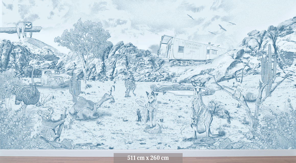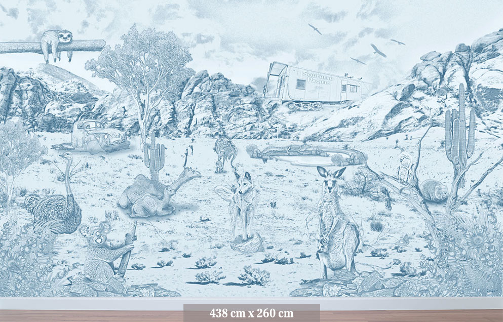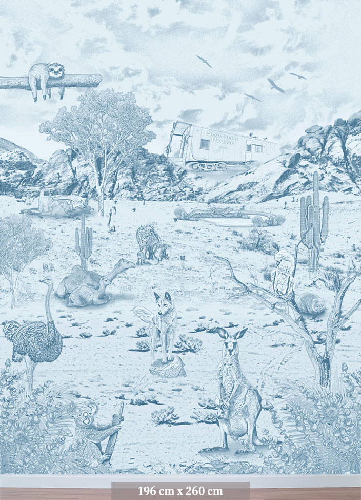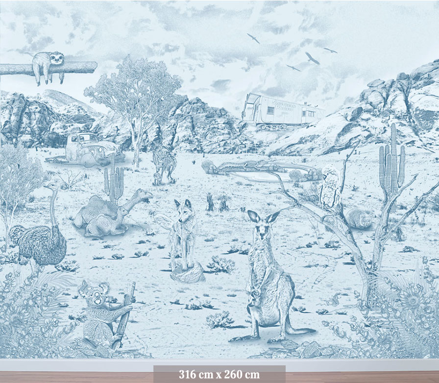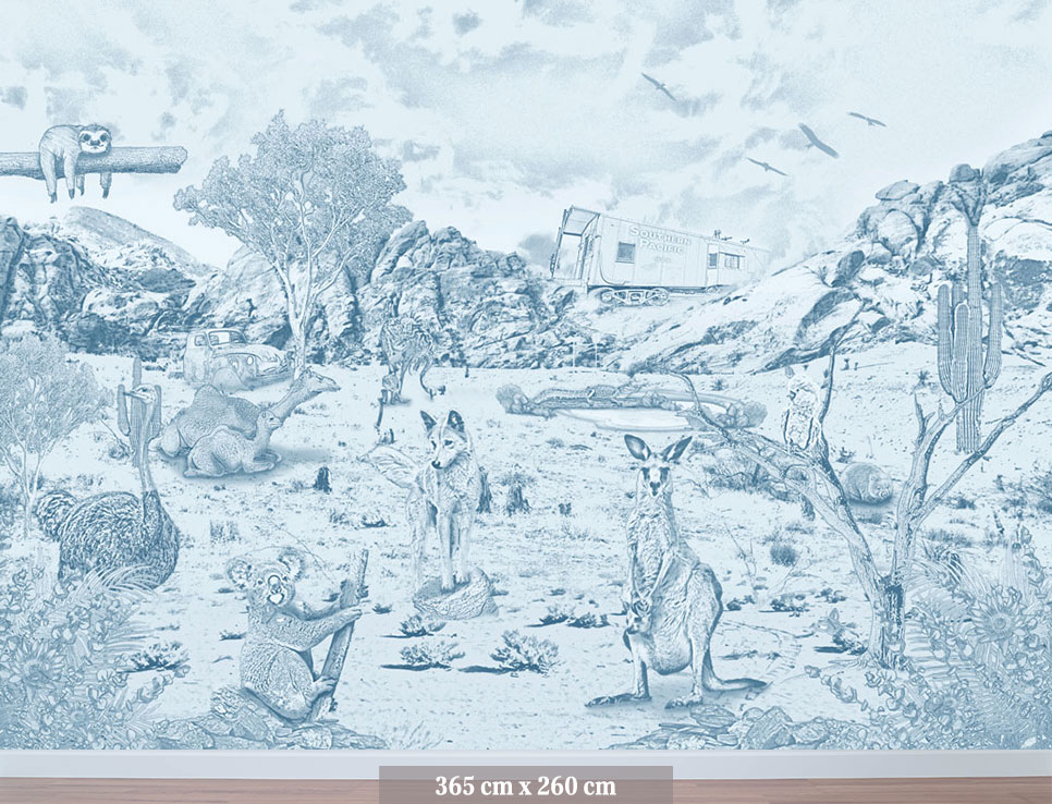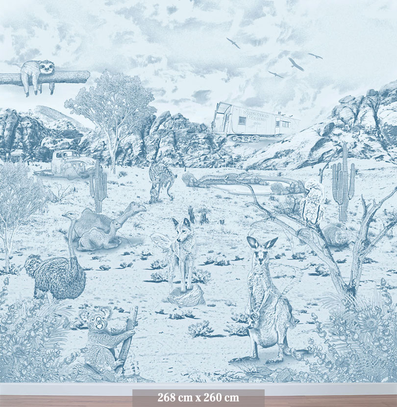 Diep in het hart van Australië leven dieren die je nergens anders vindt. Een luiaard en kaketoe rusten hoog in de boom, kangoeroes springen over het dorre landschap langs een woelende wombat met in de verte een krokodil rustend aan het water. Struisvogels en een dingo stappen nieuwsgierig rond tussen struiken en rotsen in het ruige landschap. Het Australische dieren behang struisvogels van Moodies in een zacht luchtblauwe krijtkleur brengt de unieke dieren van de Outback direct naar de jongens babykamer of kinderkamer. Het resultaat: een rustige, sfeervolle wand die fantasie, avontuur oproept en tegelijk een jongenskamer die knusheid en warmte biedt.