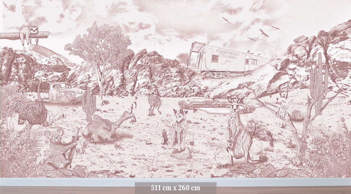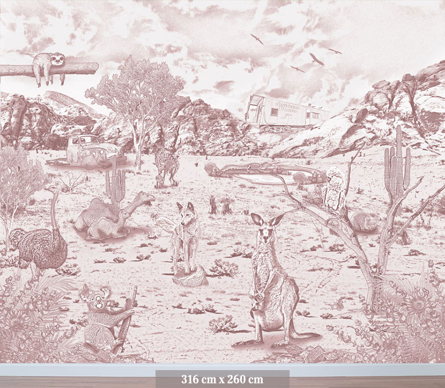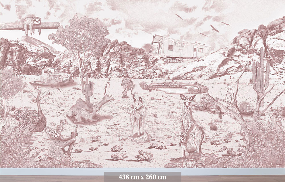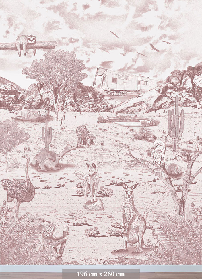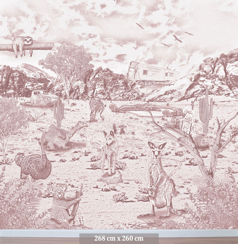 Diep in het hart van Australië leven dieren die je nergens anders vindt. Een luiaard en kaketoe rusten hoog in de boom, kangoeroes springen over het dorre landschap langs een woelende wombat met in de verte een krokodil rustend aan het water. Struisvogels en een dingo stappen nieuwsgierig rond tussen struiken en rotsen in het ruige landschap. Het Australische dieren behang struisvogels van Moodies in een zacht oudroze krijtkleur brengt de unieke dieren van de Outback direct naar de babykamer of kinderkamer van jullie kleine meid. Het resultaat: een rustige, sfeervolle wand die fantasie, avontuur oproept en tegelijk een meisjes kamer die knusheid en warmte biedt.