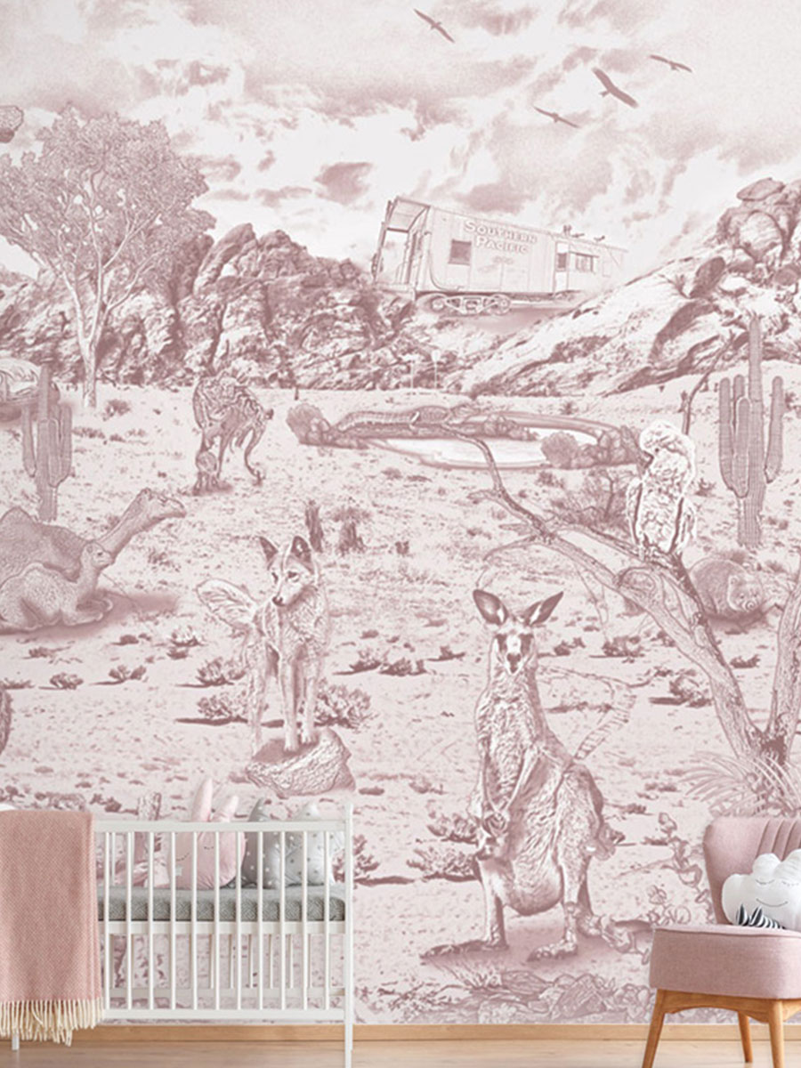 Breng de Outback naar de kinderkamer met het Australische dieren behang struisvogels oudroze van Moodies