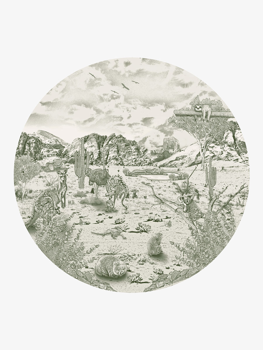 Diep in het hart van Australië leven dieren die je nergens anders vindt. Een luiaard en koala rusten hoog in de boom, kangoeroes springen over het dorre landschap langs een woelende wombat met in de verte een krokodil rustend aan het water. Struisvogels en een hagedis stappen nieuwsgierig rond tussen struiken en rotsen in het ruige landschap. De Australische dieren behangcirkel koala’s van Moodies in een zacht mosgroene krijtkleur brengt de unieke dieren van de Outback direct naar de babykamer en kinderkamer. Het resultaat: een rustige, sfeervolle wand die fantasie, avontuur oproept en tegelijk knusheid en warmte biedt.