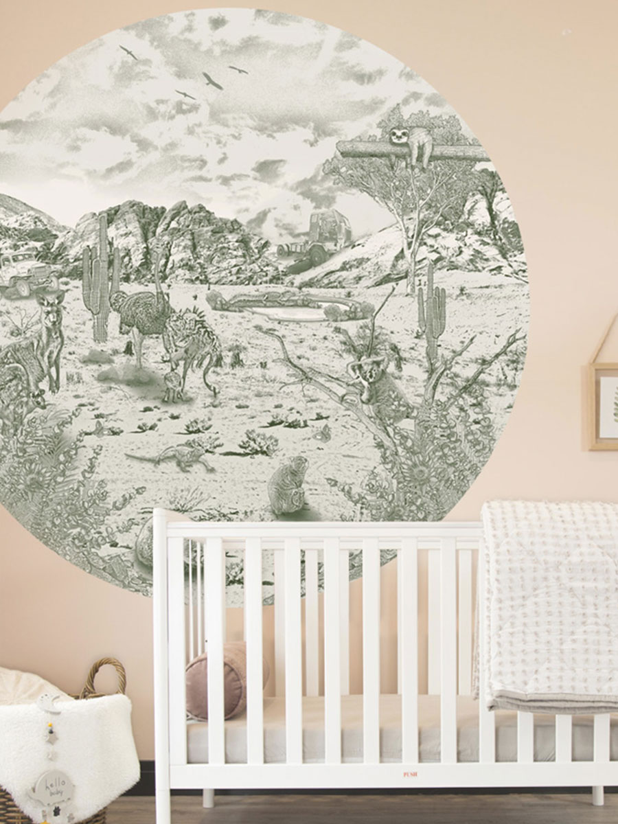 De groene behangcirkel past perfect bij een natuurlijke, moderne of Scandinavische babykamer of kinderkamer. De illustraties geven een warme, speelse uitstraling zonder druk te ogen. Ideaal voor ouders die op zoek zijn naar een kwalitatief stoere behangcirkel die ook een fijne, knusse sfeer creëert.