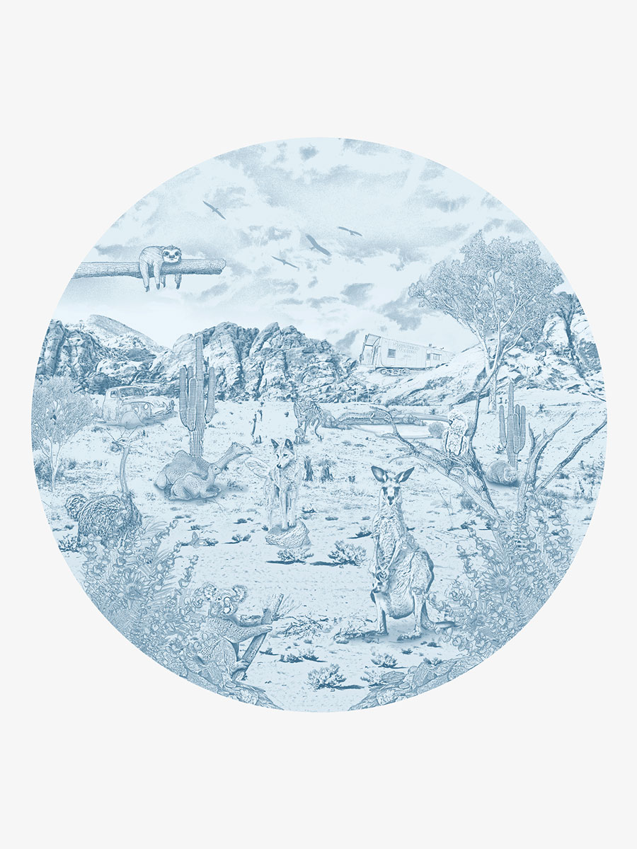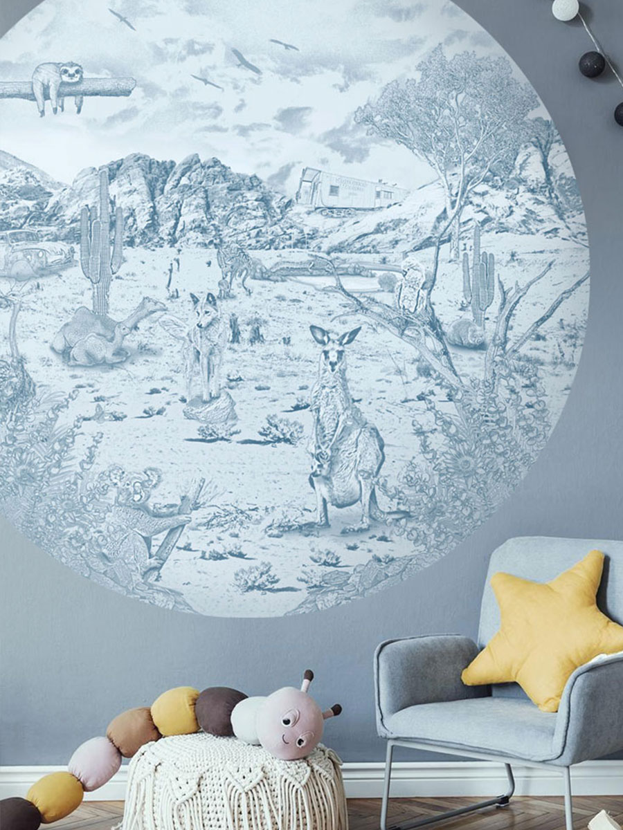 Diep in het hart van Australië leven dieren die je nergens anders vindt. Een luiaard en kaketoe rusten hoog in de boom, kangoeroes springen over het dorre landschap langs een woelende wombat met in de verte een krokodil rustend aan het water. Struisvogels en een dingo stappen nieuwsgierig rond tussen struiken en rotsen in het ruige landschap. De Australische dieren behangcirkel struisvogels van Moodies in een zacht luchtblauwe krijtkleur brengt de unieke dieren van de Outback direct naar de jongens babykamer of kinderkamer. Het resultaat: een rustige, sfeervolle wand die fantasie, avontuur oproept en tegelijk een jongenskamer die knusheid en warmte biedt.