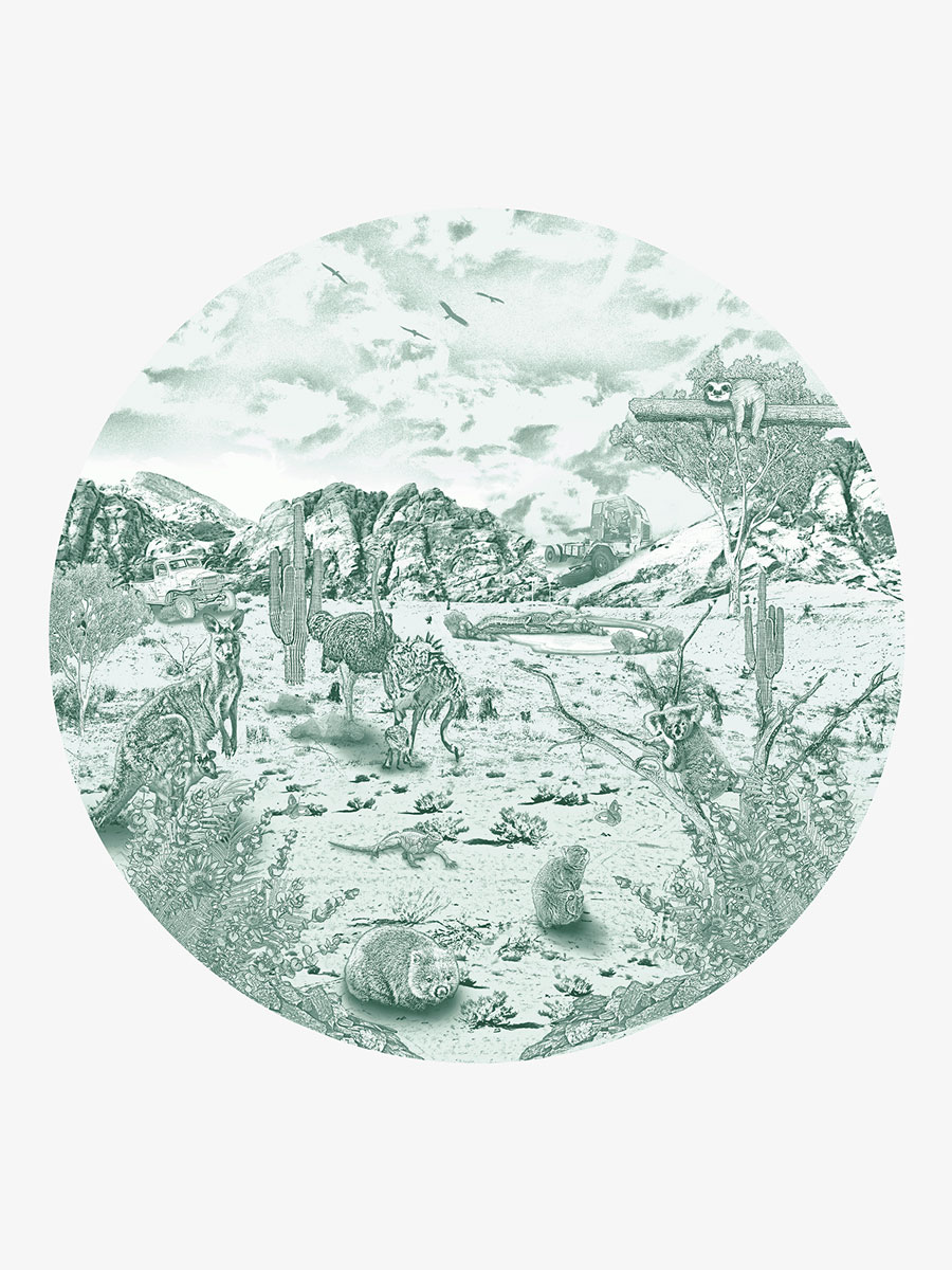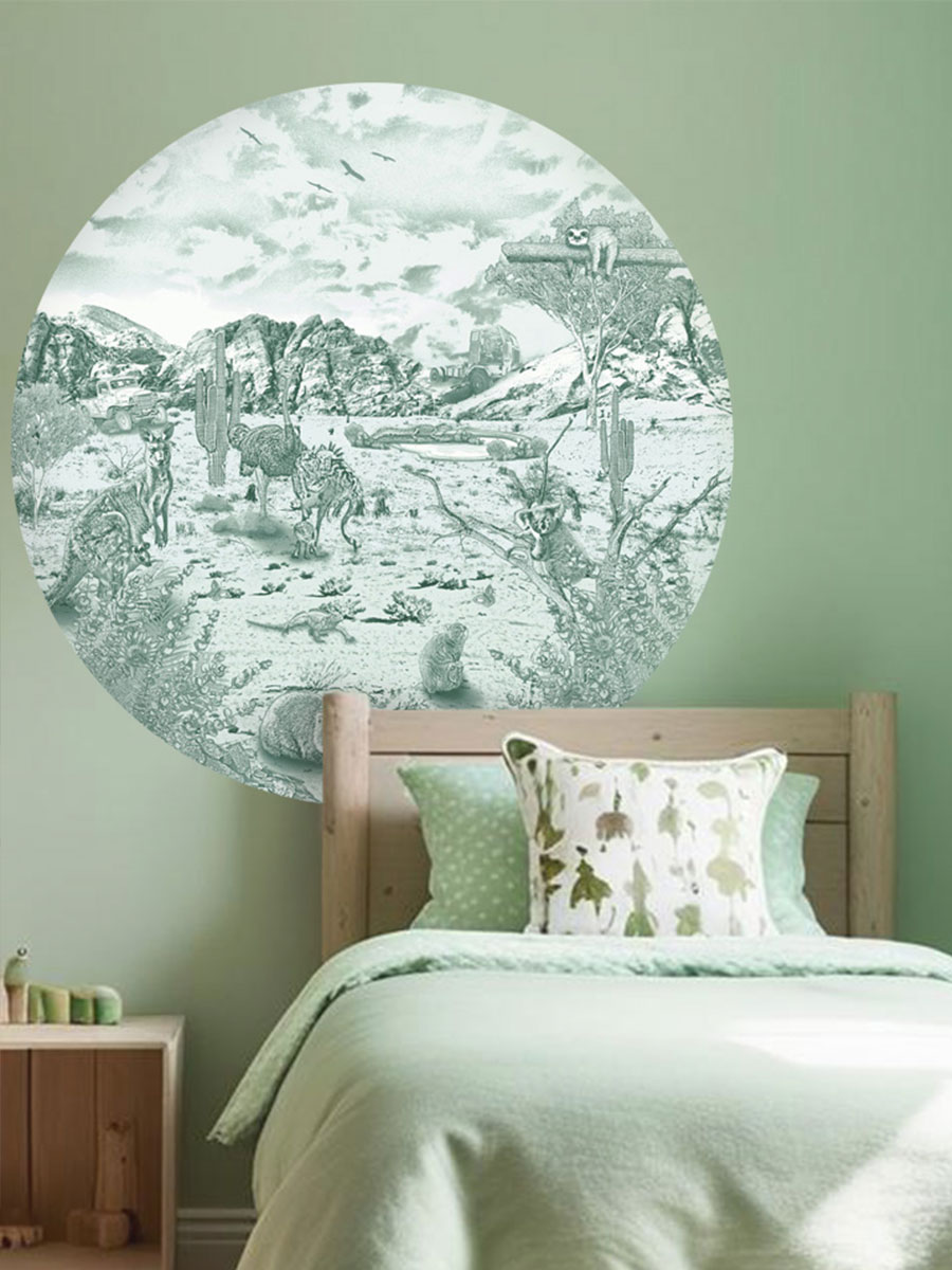 Diep in het hart van Australië leven dieren die je nergens anders vindt. Een luiaard en koala rusten hoog in de boom, kangoeroes springen over het dorre landschap langs een woelende wombat met in de verte een krokodil rustend aan het water. Struisvogels en een hagedis stappen nieuwsgierig rond tussen struiken en rotsen in het ruige landschap. De Australische dieren muursticker koala’s van Moodies in een zacht diepgroene krijtkleur brengt de unieke dieren van de Outback direct naar de babykamer of kinderkamer. Het resultaat: een rustige, sfeervolle wand die fantasie, avontuur oproept en tegelijk knusheid en warmte biedt.