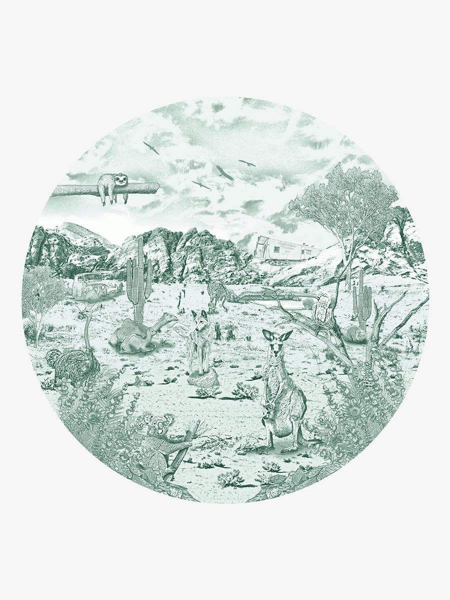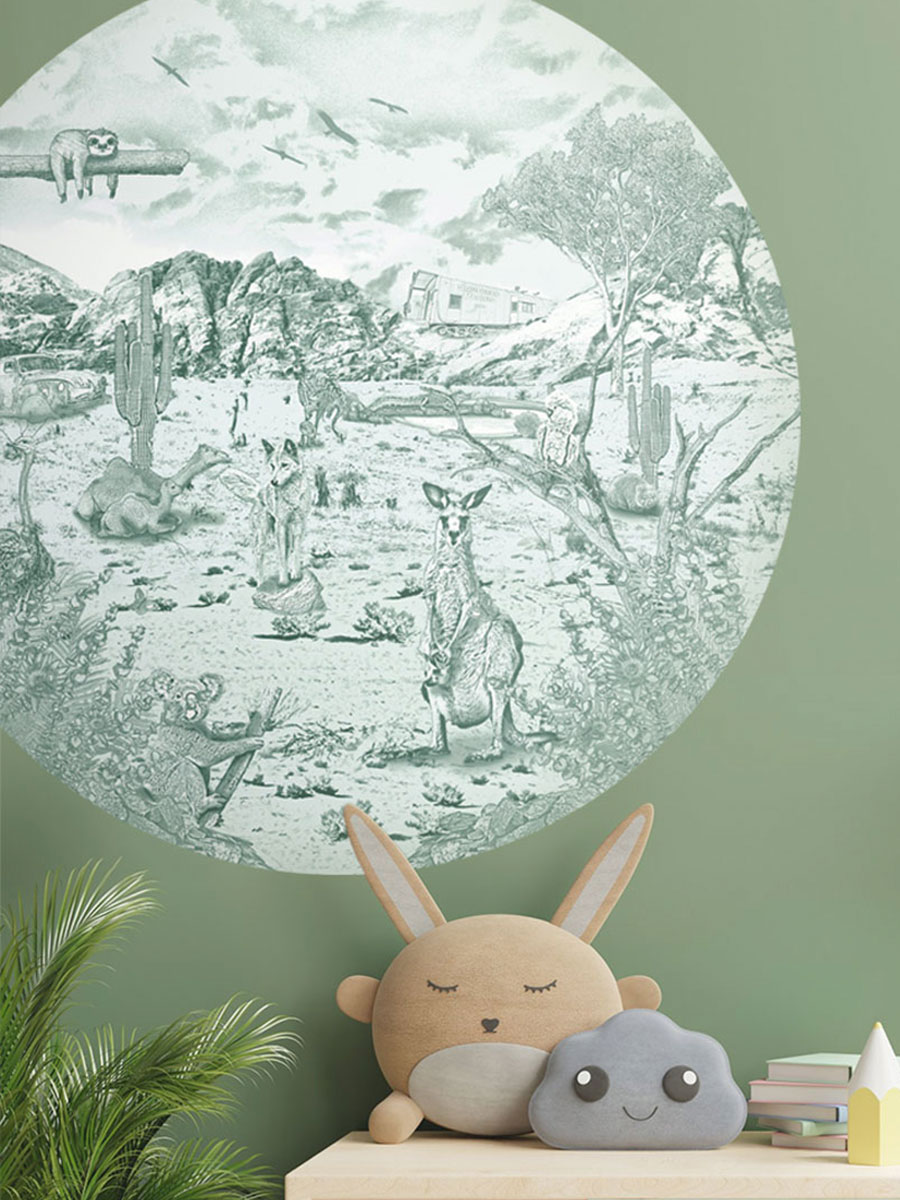 Diep in het hart van Australië leven dieren die je nergens anders vindt. Een luiaard en kaketoe rusten hoog in de boom, kangoeroes springen over het dorre landschap langs een woelende wombat met in de verte een krokodil rustend aan het water. Struisvogels en een dingo stappen nieuwsgierig rond tussen struiken en rotsen in het ruige landschap. De Australische dieren muursticker struisvogels van Moodies in een zacht diepgroene krijtkleur brengt de unieke dieren van de Outback direct naar de babykamer en kinderkamer. Het resultaat: een rustige, sfeervolle wand die fantasie, avontuur oproept en tegelijk knusheid en warmte biedt.
