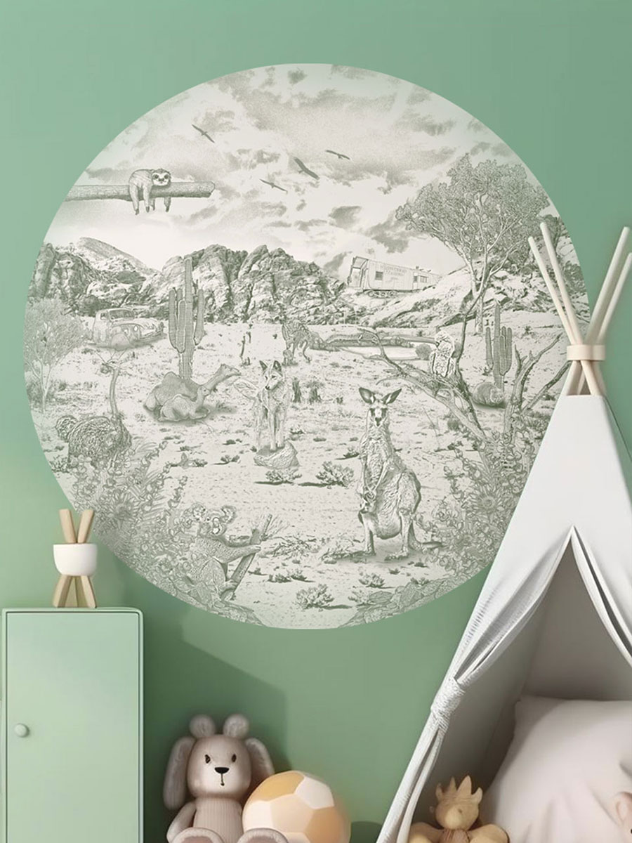 Diep in het hart van Australië leven dieren die je nergens anders vindt. Een luiaard en kaketoe rusten hoog in de boom, kangoeroes springen over het dorre landschap langs een woelende wombat met in de verte een krokodil rustend aan het water. Struisvogels en een dingo stappen nieuwsgierig rond tussen struiken en rotsen in het ruige landschap. De Australische dieren muursticker struisvogels van Moodies in een zacht mosgroene krijtkleur brengt de unieke dieren van de Outback direct naar de babykamer en kinderkamer. Het resultaat: een rustige, sfeervolle wand die fantasie, avontuur oproept en tegelijk knusheid en warmte biedt.