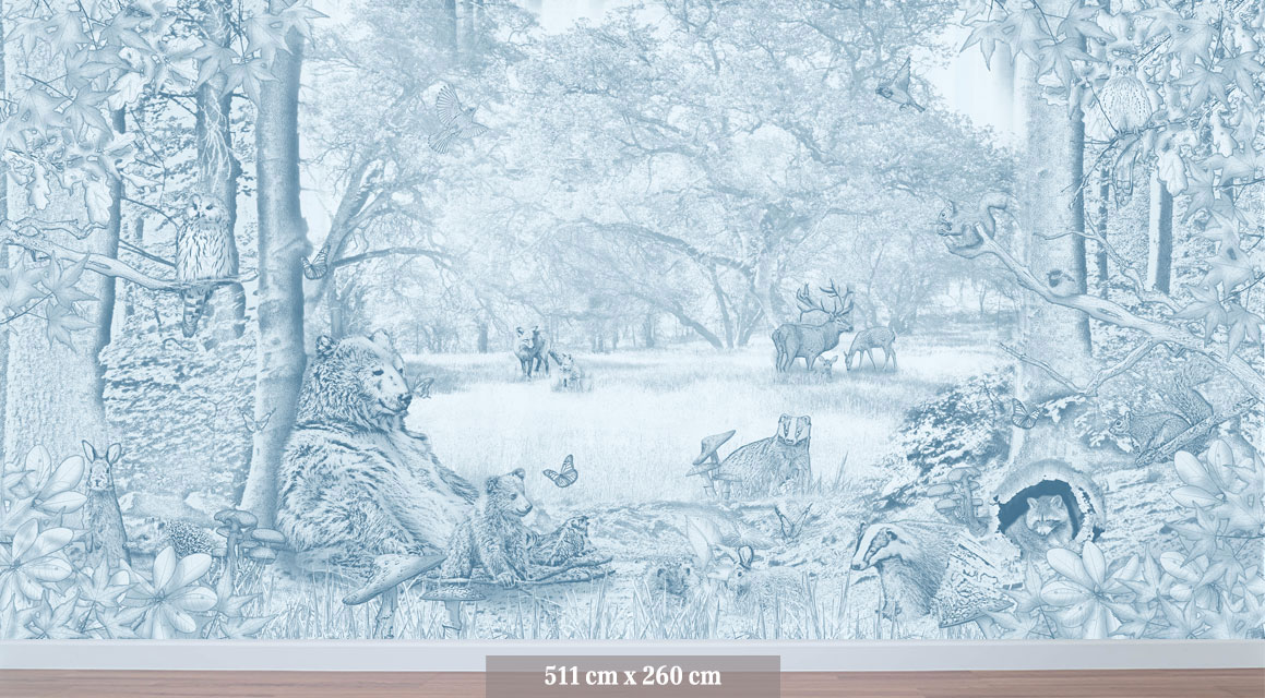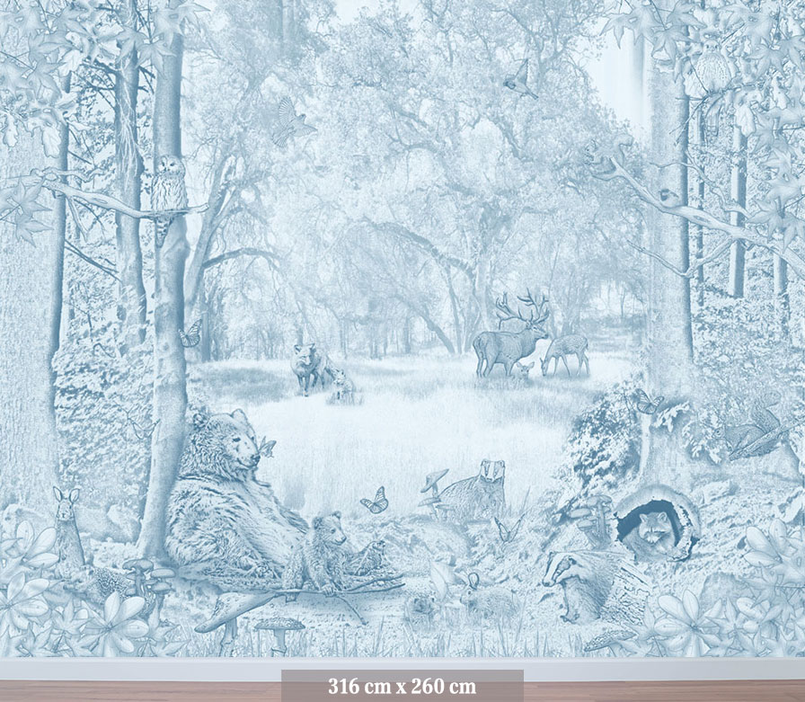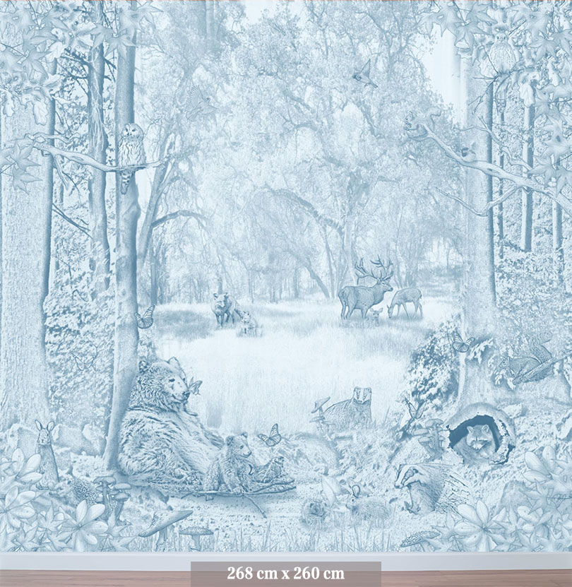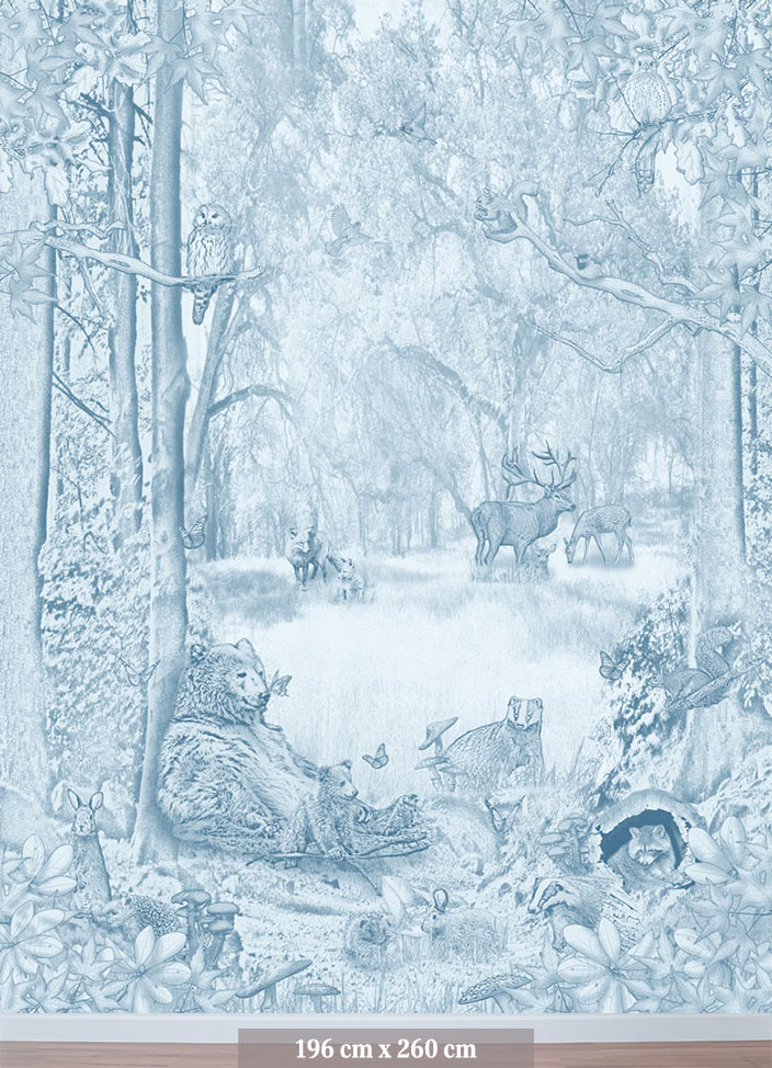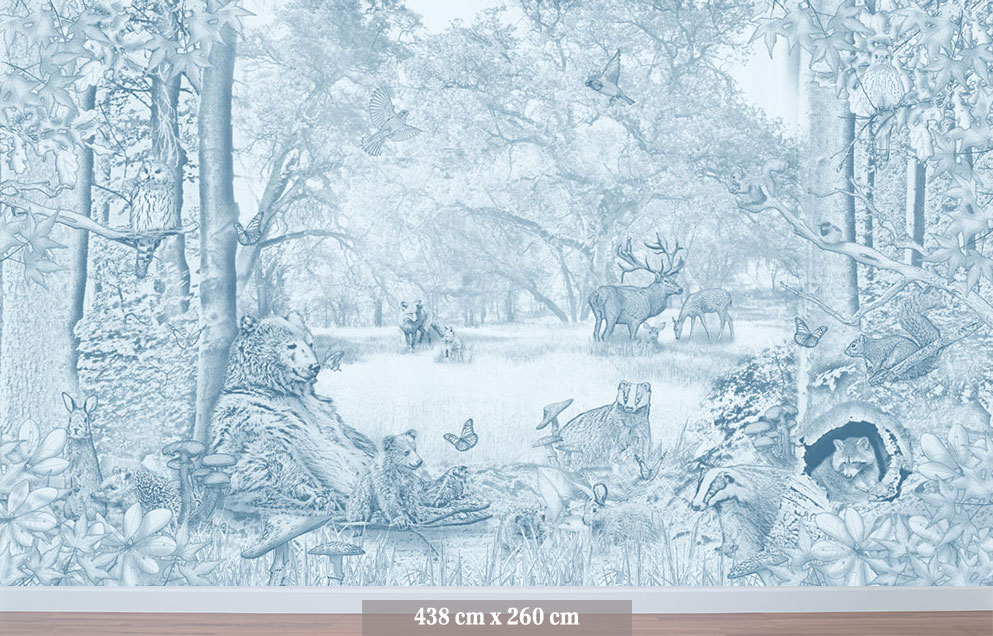Geïnspireerd op de rust en warmte van het bos, brengt dit bosdieren behang beren van Moodies direct sfeer in de jongens babykamer of kinderkamer. De zacht luchtblauwe krijtkleur zorgt voor een rustige uitstraling, terwijl de vriendelijke bosdieren de fantasie van jullie kleine jongen prikkelen. In de voorgrond spelen beren, terwijl hertjes rustig grazen in de weide met daar ook vosjes. Rondom hen snuffelen er schattige egeltjes, konijntjes en dassen door de bladeren en bloemen van het bos. Hoog in de boom zit een uil, eekhoorntjes en andere vogeltjes omgeven door bomen, paddestoelen, bladeren en vlinders. Dit blauwe behang maakt van een lege muur in de jongenskamer een knusse wereld vol ontdekkingen.