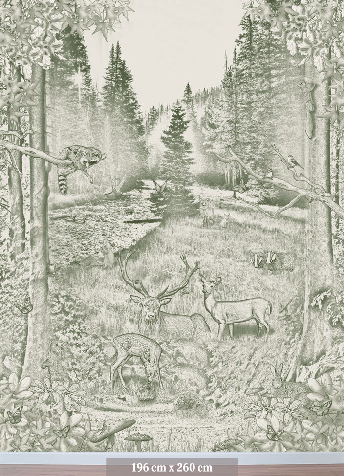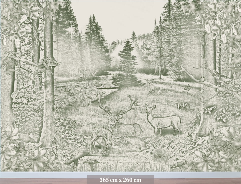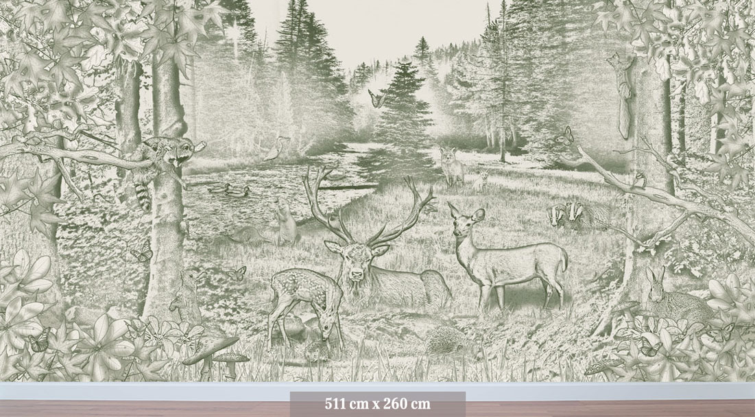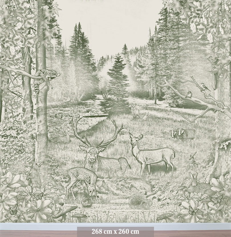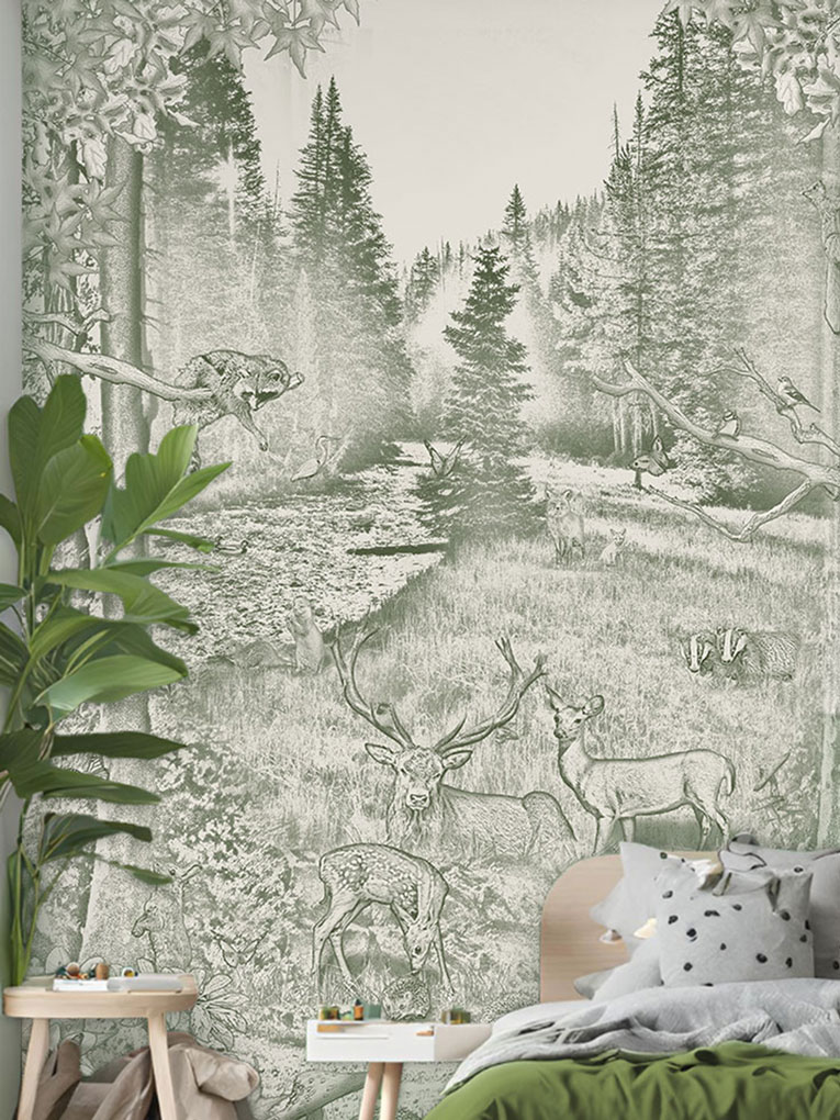 Laat de kinderkamer tot leven komen met het Bosdieren behang herten mosgroen van Moodies