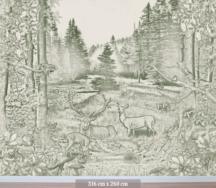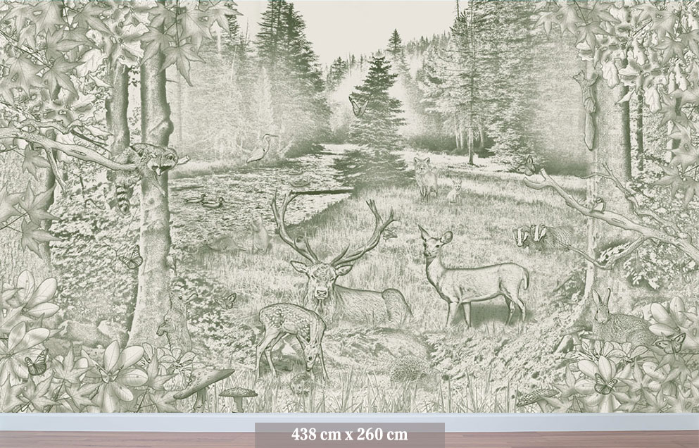 Geïnspireerd op de rust en warmte van het bos, brengt dit bosdieren behang herten van Moodies direct sfeer in de babykamer of kinderkamer. De zacht mosgroene krijtkleur zorgt voor een rustige uitstraling, terwijl de vriendelijke bosdieren de fantasie van je kind prikkelen. In de voorgrond spelen hertjes, terwijl dassen en vosjes rustig grazen in de weide. Bij het water zwemmen de eendjes en ottertjes, met langs de kant een reiger. Rondom hen snuffelen er schattige egeltjes en konijntjes door de bladeren en bloemen van het bos. Hoog in de boom zit een wasbeer, eekhoorntjes en vogeltjes omgeven door bomen, paddenstoelen, bladeren en vlinders. Dit schattige behang maakt van een lege muur een knusse wereld vol ontdekkingen in elke babykamer of kinderkamer.