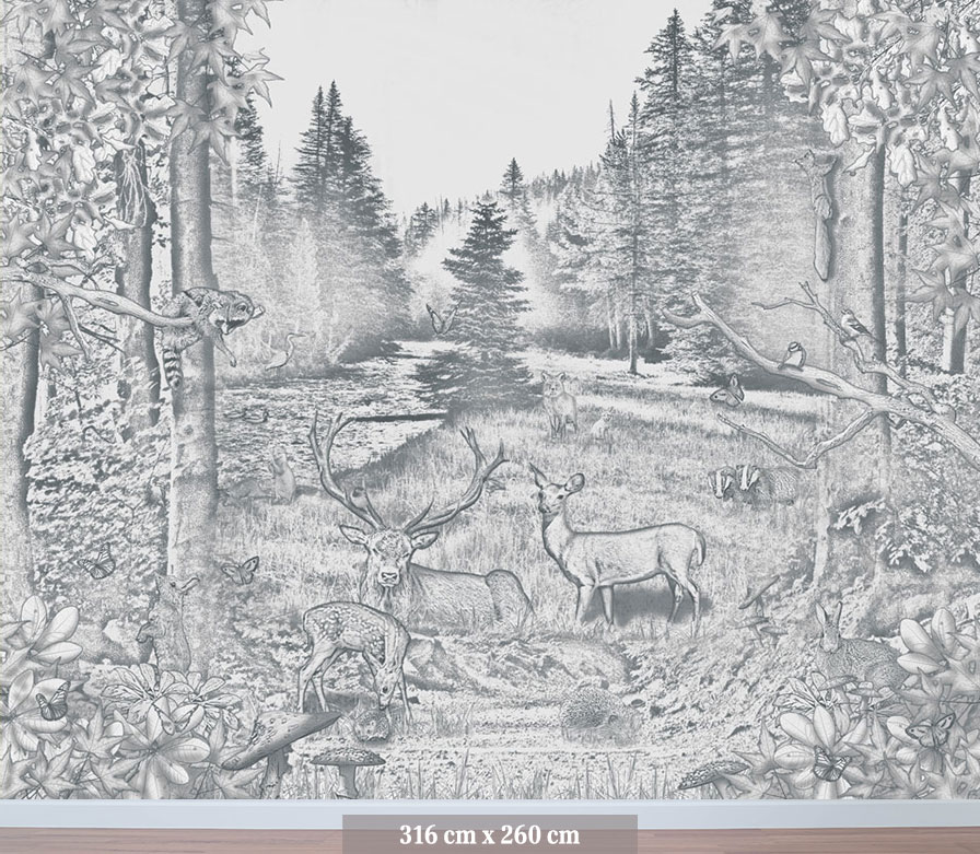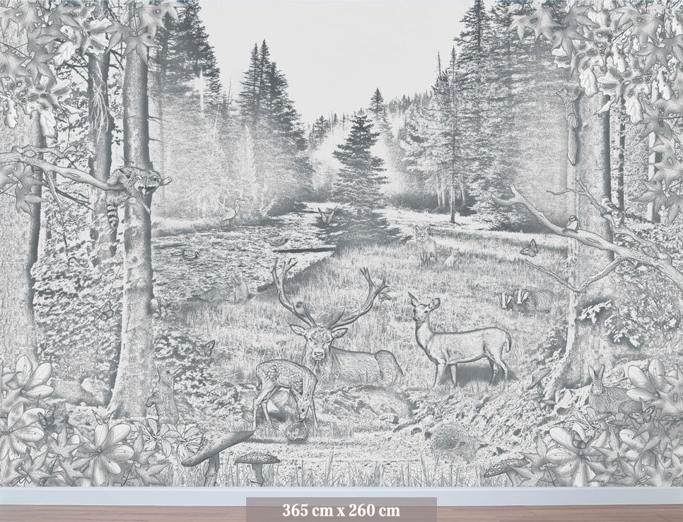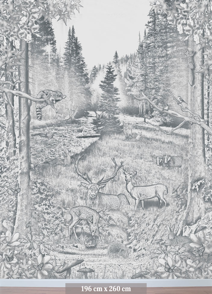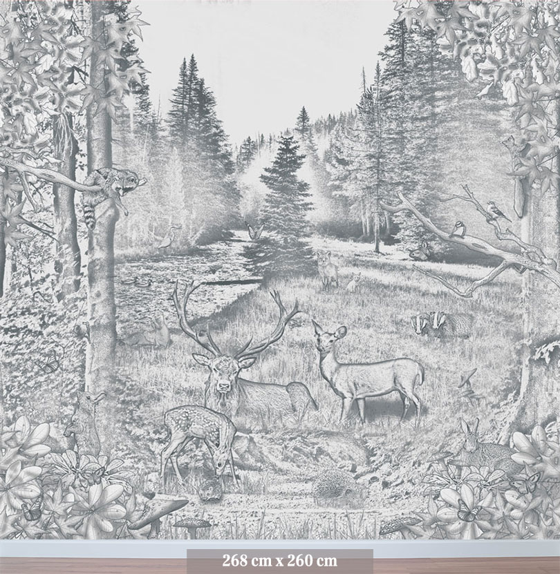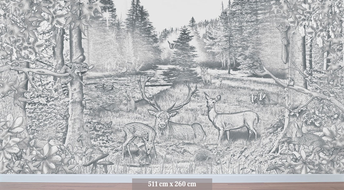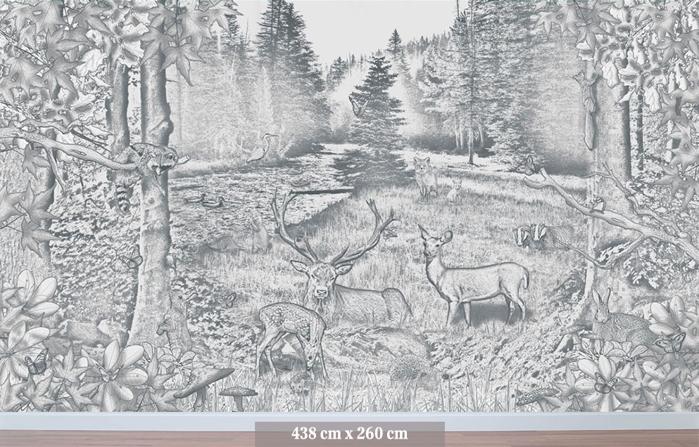 Geïnspireerd op de rust en warmte van het bos, brengt dit bosdieren behang herten van Moodies direct sfeer in de babykamer of kinderkamer. De zachte potloodgrijze kleur zorgt voor een rustige uitstraling, terwijl de vriendelijke bosdieren de fantasie van je kind prikkelen. In de voorgrond spelen hertjes, terwijl dassen en vosjes rustig grazen in de weide. Bij het water zwemmen de eendjes en ottertjes, met langs de kant een reiger. Rondom hen snuffelen er schattige egeltjes en konijntjes door de bladeren en bloemen van het bos. Hoog in de boom zit een wasbeer, eekhoorntjes en vogeltjes omgeven door bomen, paddenstoelen, bladeren en vlinders. Dit schattige behang maakt van een lege muur een knusse wereld vol ontdekkingen in elke babykamer of kinderkamer.