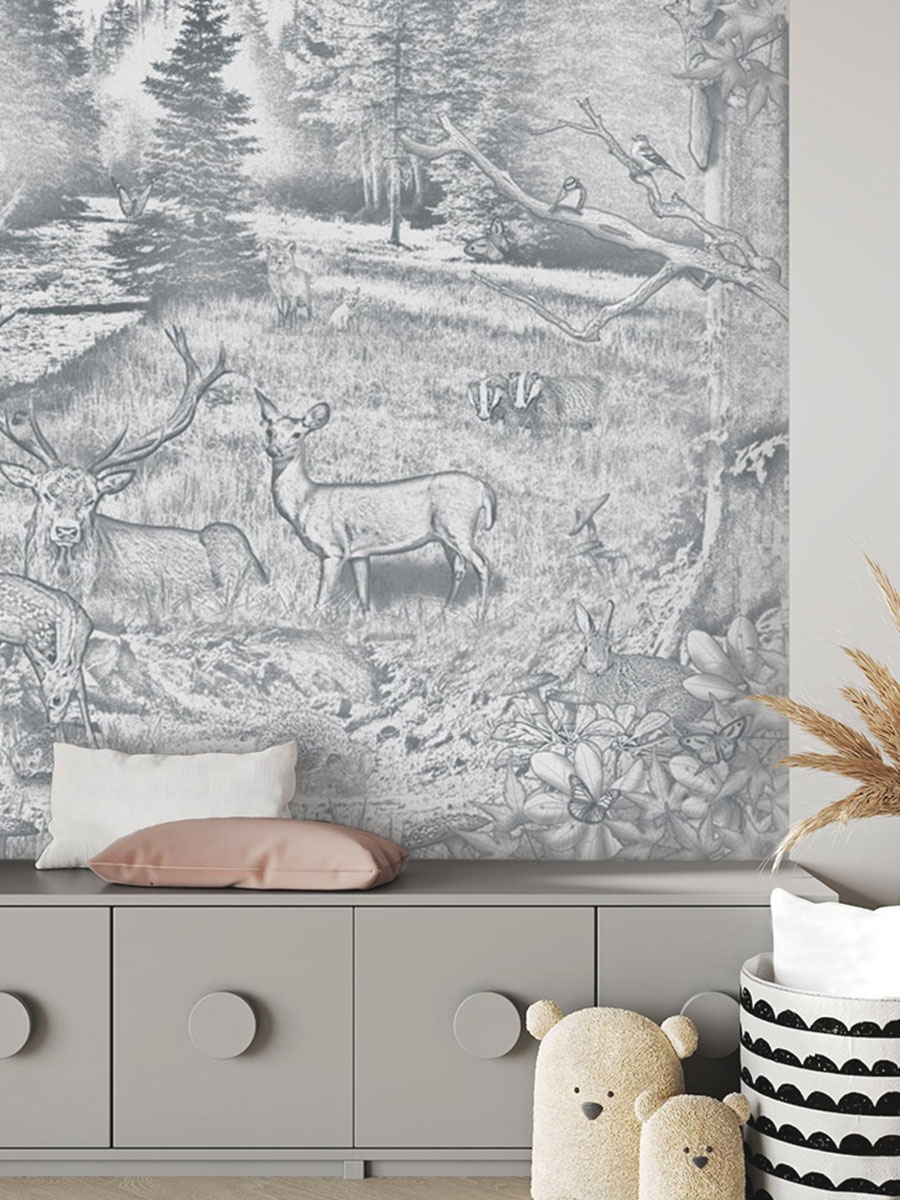 Laat de kinderkamer tot leven komen met het Bosdieren behang herten potloodgrijs van Moodies