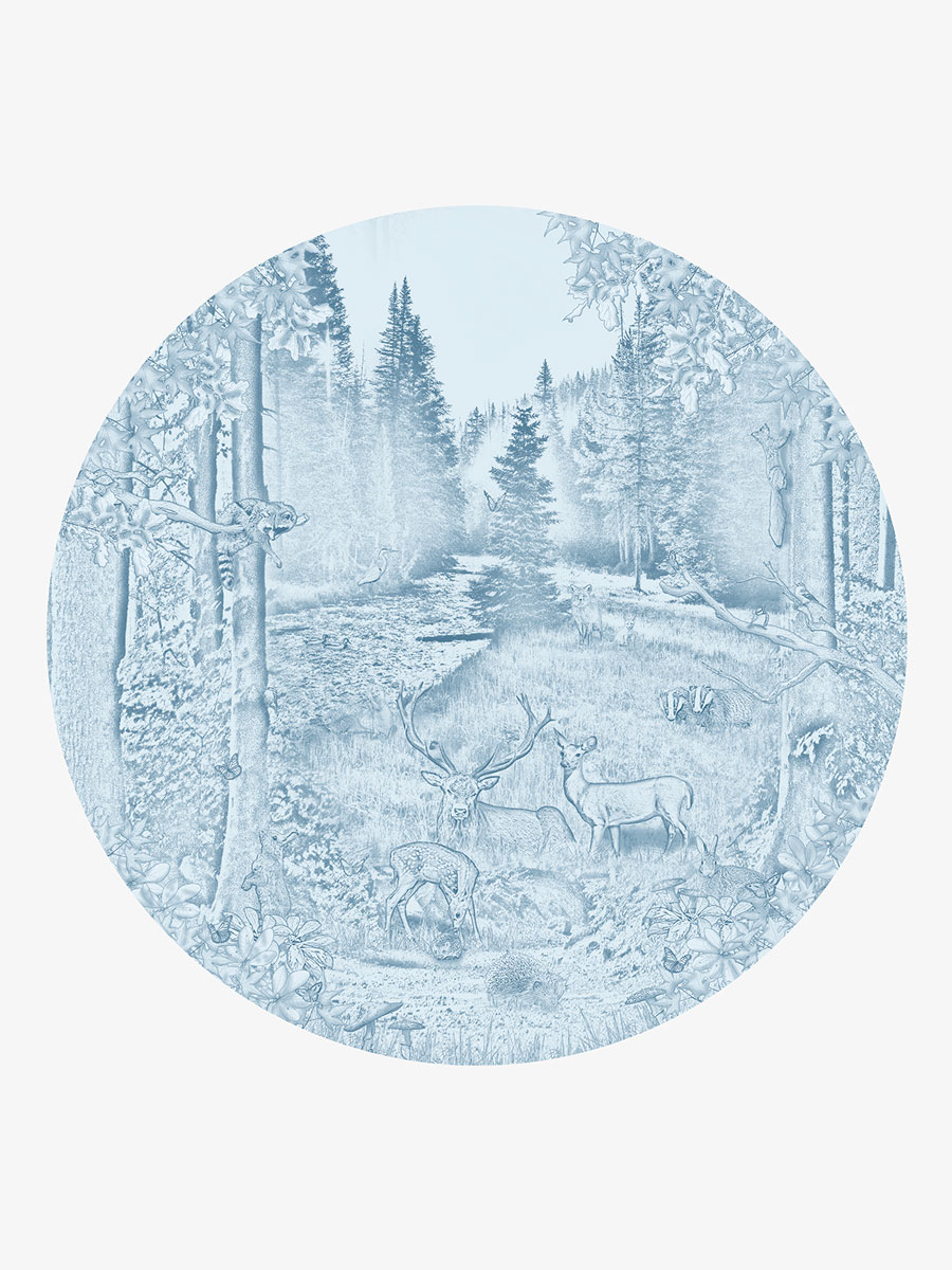 Geïnspireerd op de rust en warmte van het bos, brengt deze bosdieren behangcirkel herten van Moodies direct sfeer in de jongens babykamer of kinderkamer. De zacht luchtblauwe krijtkleur zorgt voor een rustige uitstraling, terwijl de vriendelijke bosdieren de fantasie van jullie kleine jongen prikkelen. In de voorgrond spelen hertjes, terwijl dassen en vosjes rustig grazen in de weide. Bij het water zwemmen de eendjes en ottertjes, met langs de kant een reiger. Rondom hen snuffelen er schattige egeltjes en konijntjes door de bladeren en bloemen van het bos. Hoog in de boom zit een wasbeer, eekhoorntjes en vogeltjes omgeven door bomen, paddenstoelen, bladeren en vlinders. Deze blauwe behangcirkel maakt van een lege muur in de jongenskamer een knusse wereld vol ontdekkingen.