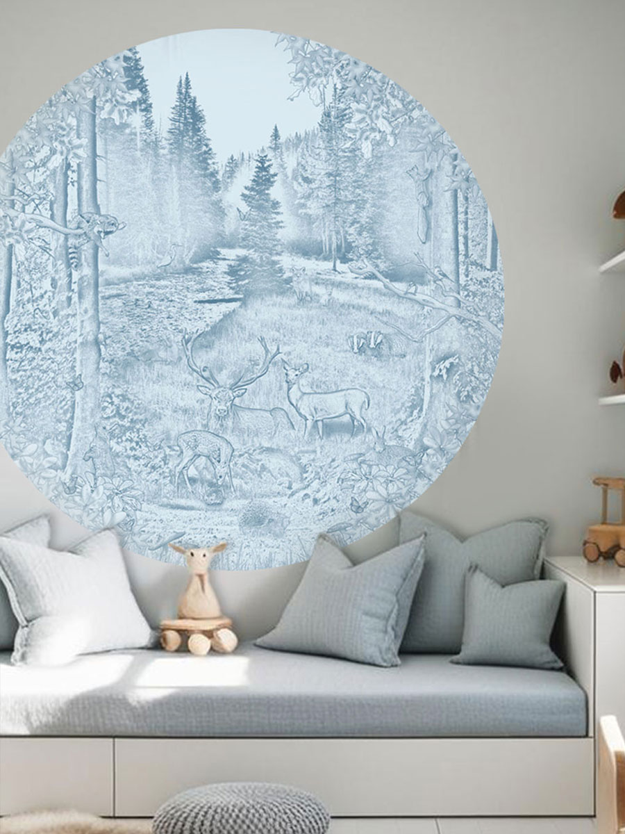 Laat de kinderkamer tot leven komen met de Bosdieren behangcirkel herten luchtblauw van Moodies
