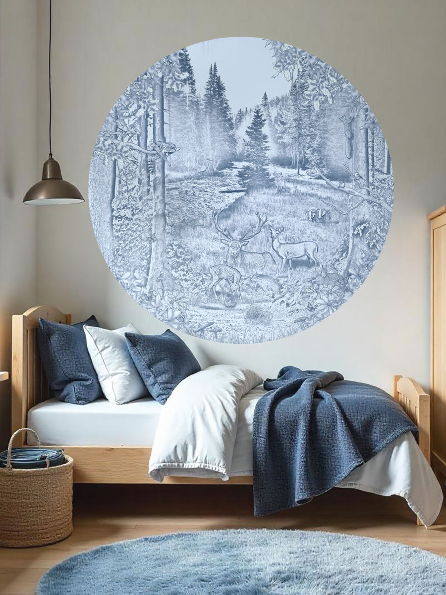 Laat de kinderkamer tot leven komen met de Bosdieren behangcirkel herten zeeblauw van Moodies