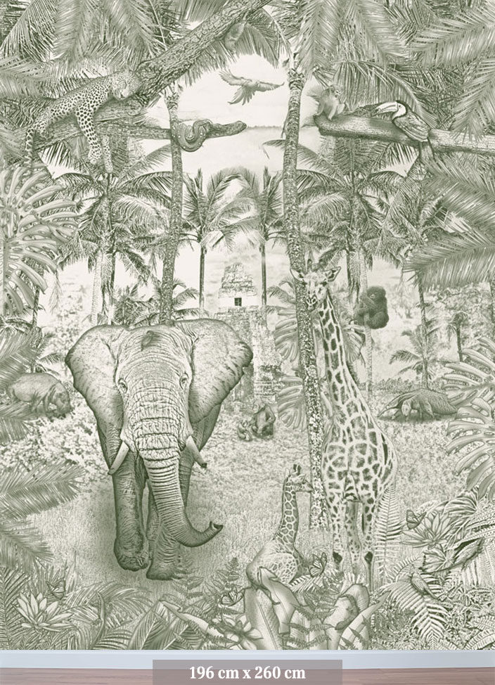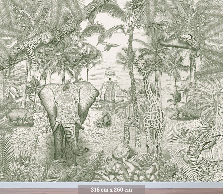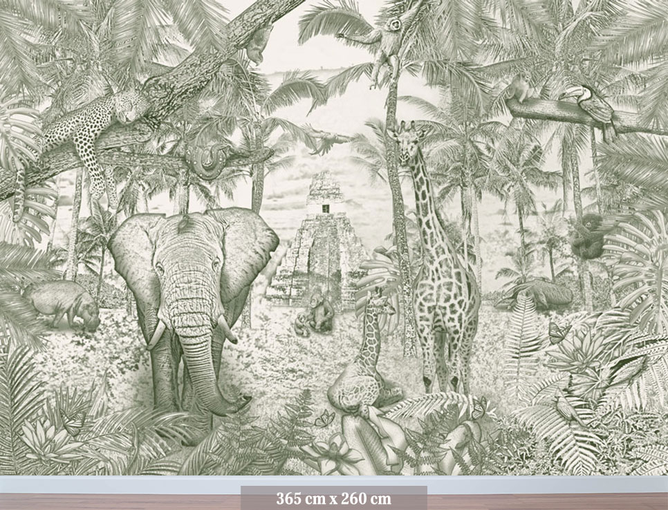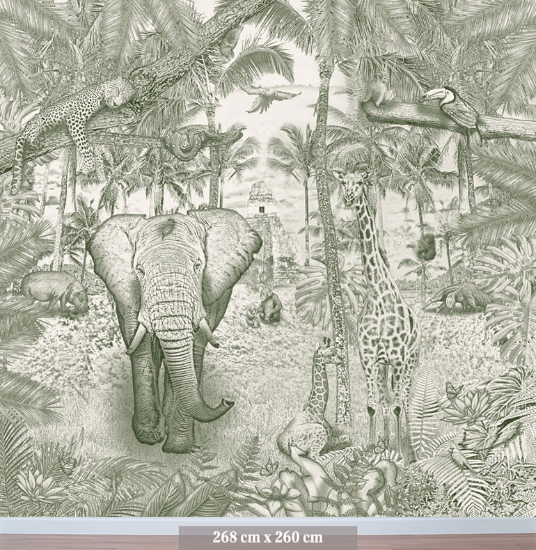 Met het jungle dieren behang giraffen van Moodies geef je de babykamer of kinderkamer een uniek karakter vol natuur, warmte en avontuur. De zacht mosgroene krijtkleur vormt een rustige basis voor een avontuurlijk décor vol wilde jungle dieren. Maak van een lege muur op de babykamer of kinderkamer een tropisch avontuur met de elegante giraffen en olifant en in de achtergrond chimpanzees, miereneter en een dwerg nijlpaard. Omringd door tropische bladeren, bloemen, hagedisjes en vlinders. Een jungle vol met slingerende apen, tropische vogels, toekan en een luierend luipaard.