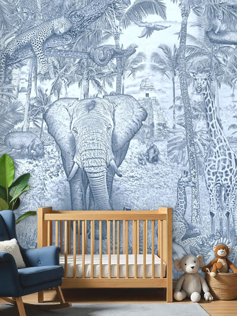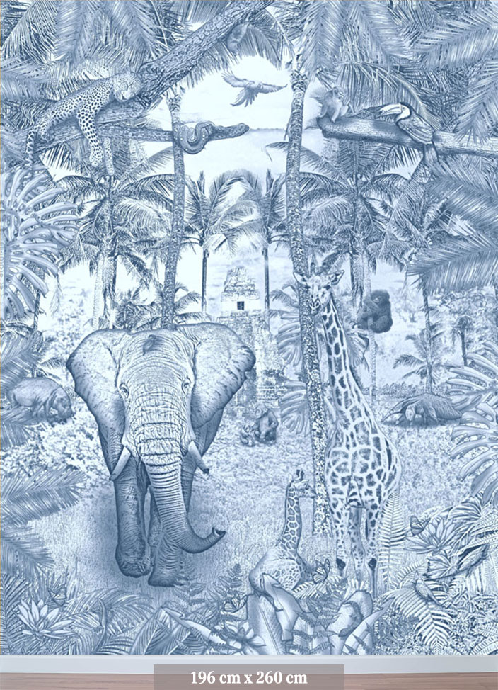 Met het jungle dieren behang giraffen van Moodies geef je de jongens babykamer of kinderkamer een uniek karakter vol natuur, warmte en avontuur. De zacht zeeblauwe krijtkleur vormt een rustige basis voor een avontuurlijk décor vol wilde jungle dieren. Maak van een lege muur op de babykamer of kinderkamer een tropisch avontuur met de elegante giraffen en olifant en in de achtergrond chimpanzees, miereneter en een dwerg nijlpaard. Omringd door tropische bladeren, bloemen, hagedisjes en vlinders. Een jungle vol met slingerende apen, tropische vogels, toekan en een luierend luipaard.