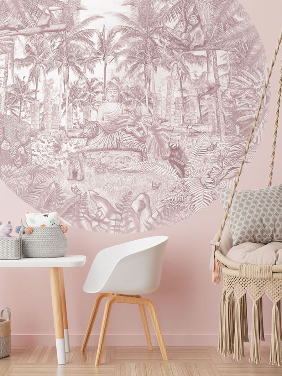 - De roze behangcirkel past in diverse interieurstijlen: van neutraal tot natuurlijk