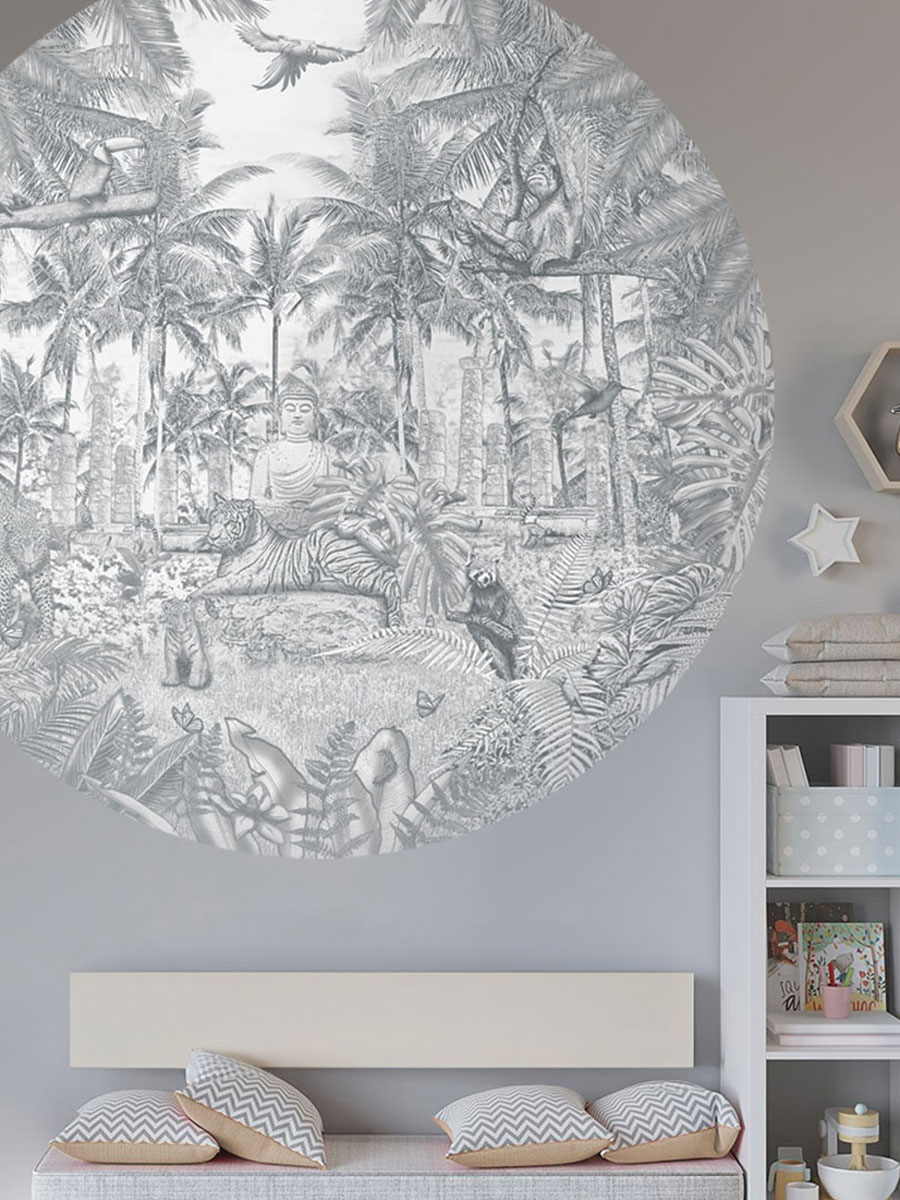 Ontdek de jungle vanuit de kinderkamer met de Jungle dieren behangcirkel tijger potloodgrijs van Moodies