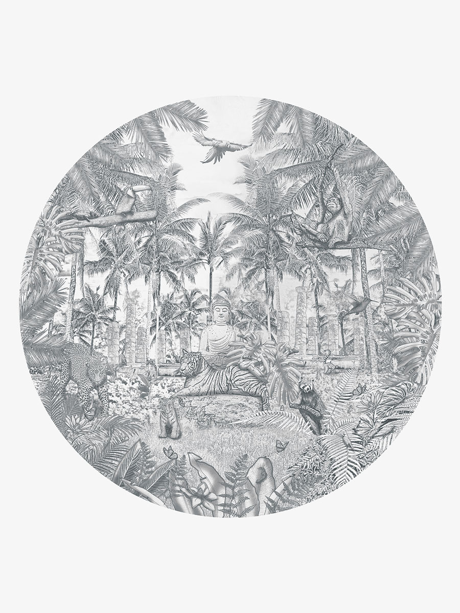 De behangcirkel heeft een matte uitstraling en schijnt niet door vanwege de grijze achterzijde. Het materiaal is een beetje rekbaar en kreukvrij.
