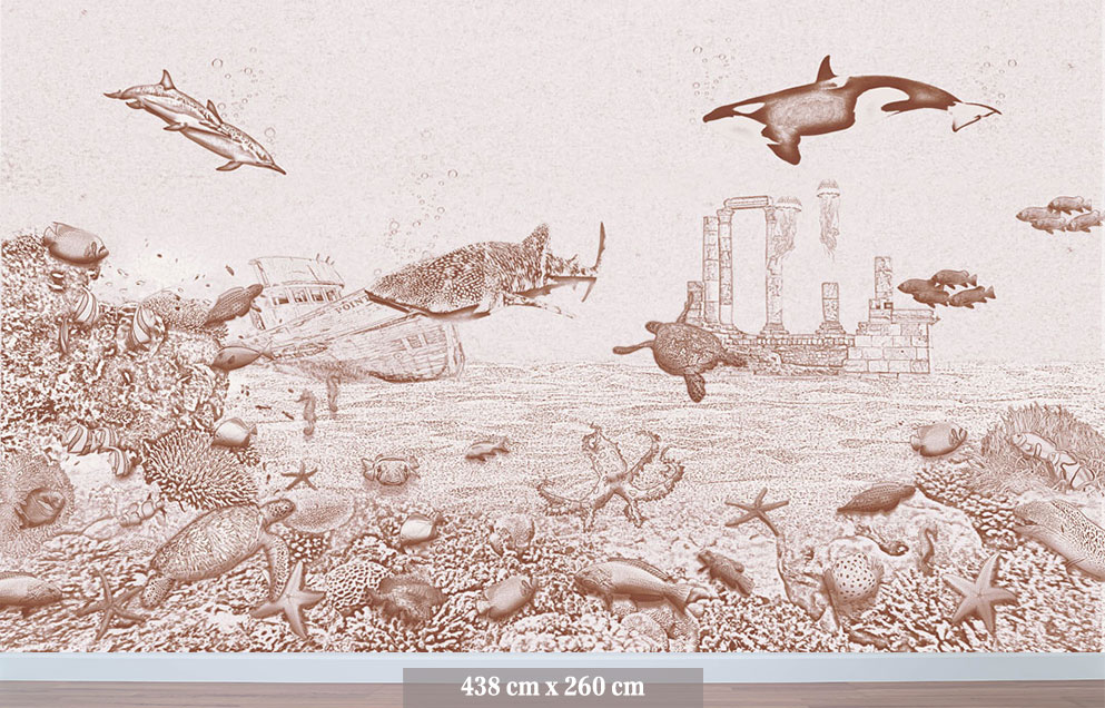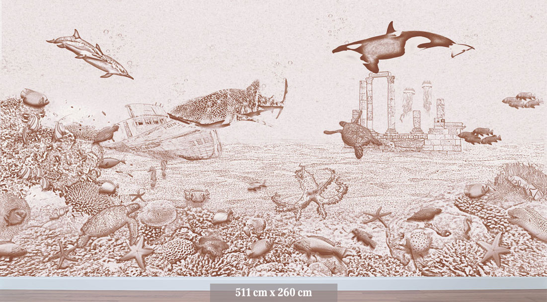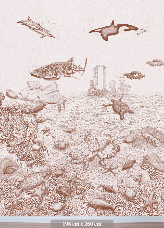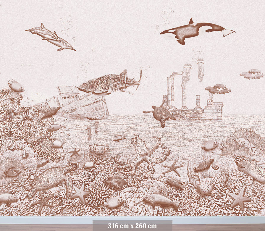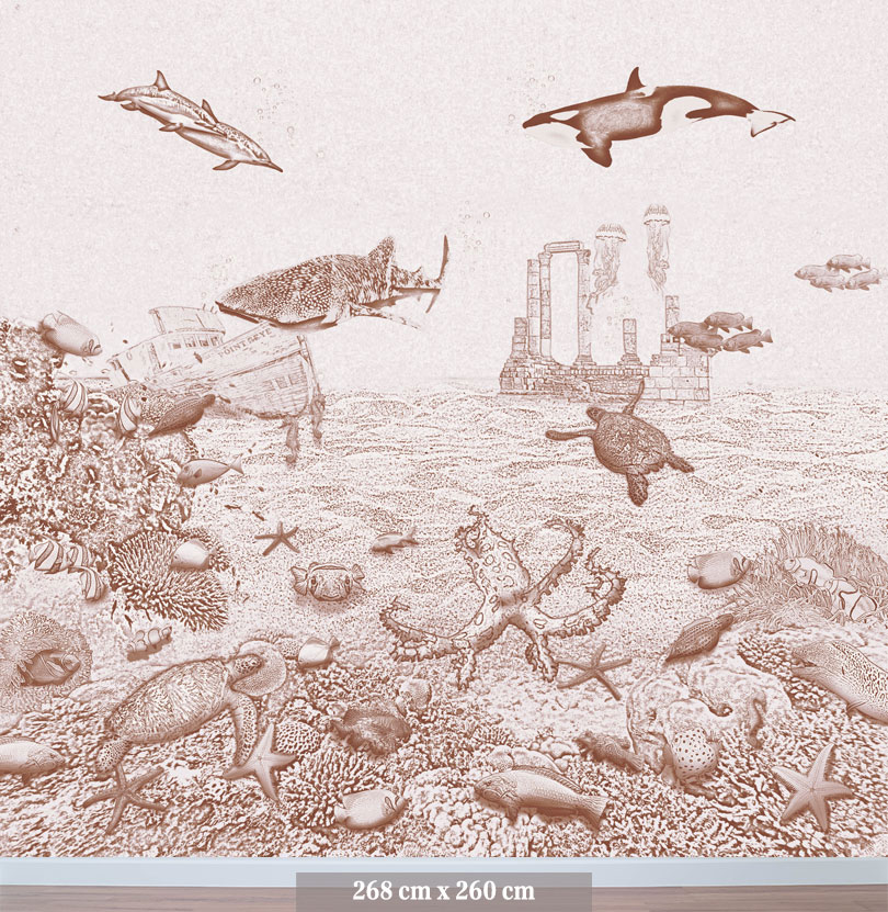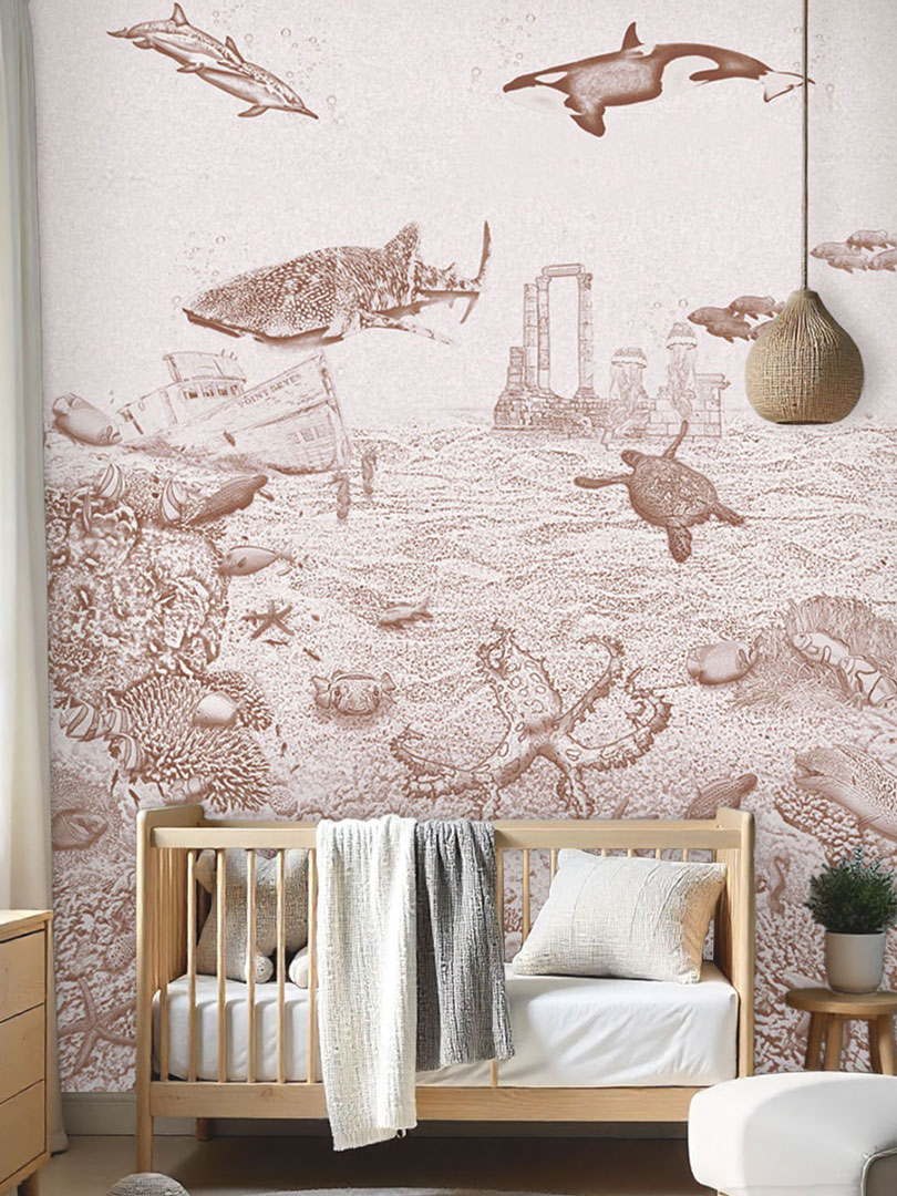 Het zeedieren behang orka van Moodies verandert de babykamer of kinderkamer in een levendige onderwaterwereld. De zacht bruine krijtkleur vormt een rustige en warme basis voor een oceaan wereld vol sierlijke visjes. Een neutraal behang dat uitnodigt tot dromen, spelen en ontspannen. Het koraal is gevuld met anemoonvissen, keizersvissen, een octopus en zelfs een nieuwsgierige aal. De orka, walvishaai en dolfijnen zwemmen in de verte voorbij, terwijl schildpadden en zeepaardjes hun weg zoeken door het water. Een bruin behang met een sfeervolle achtergrond vol oceaan dieren voor fantasie en ontdekking, geschikt voor elke kinderkamer of babykamer.