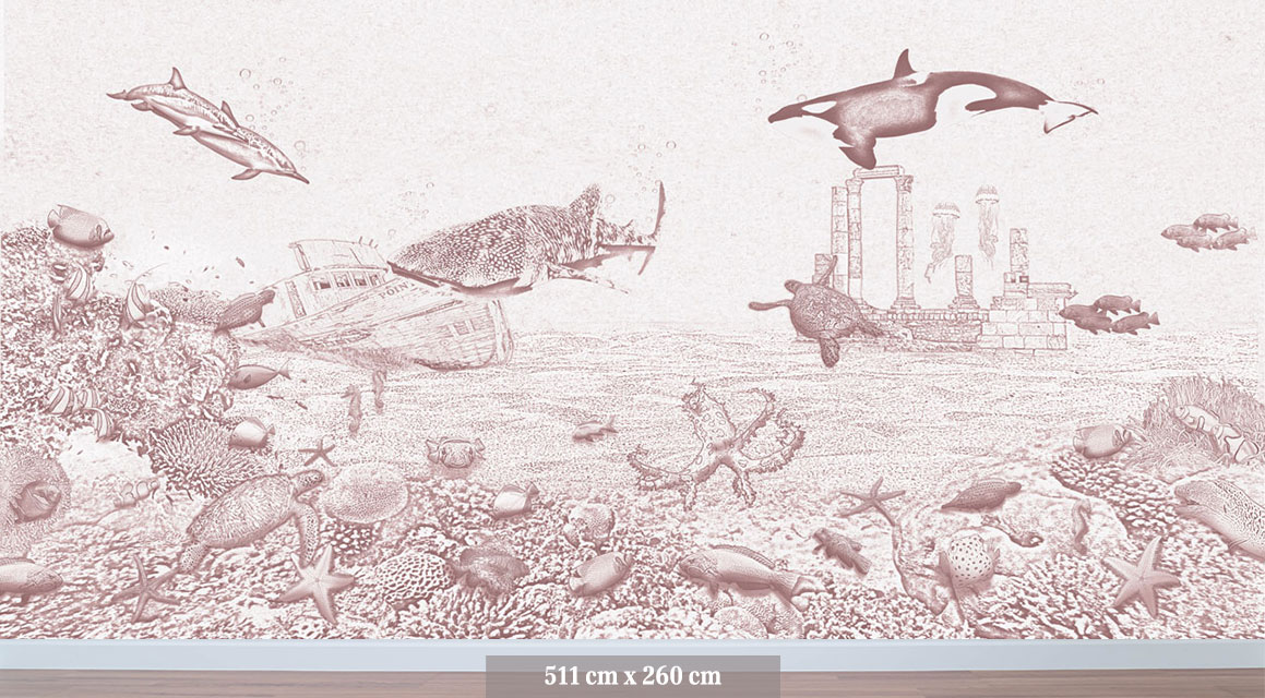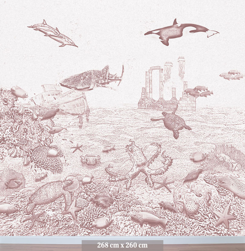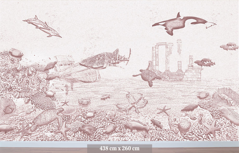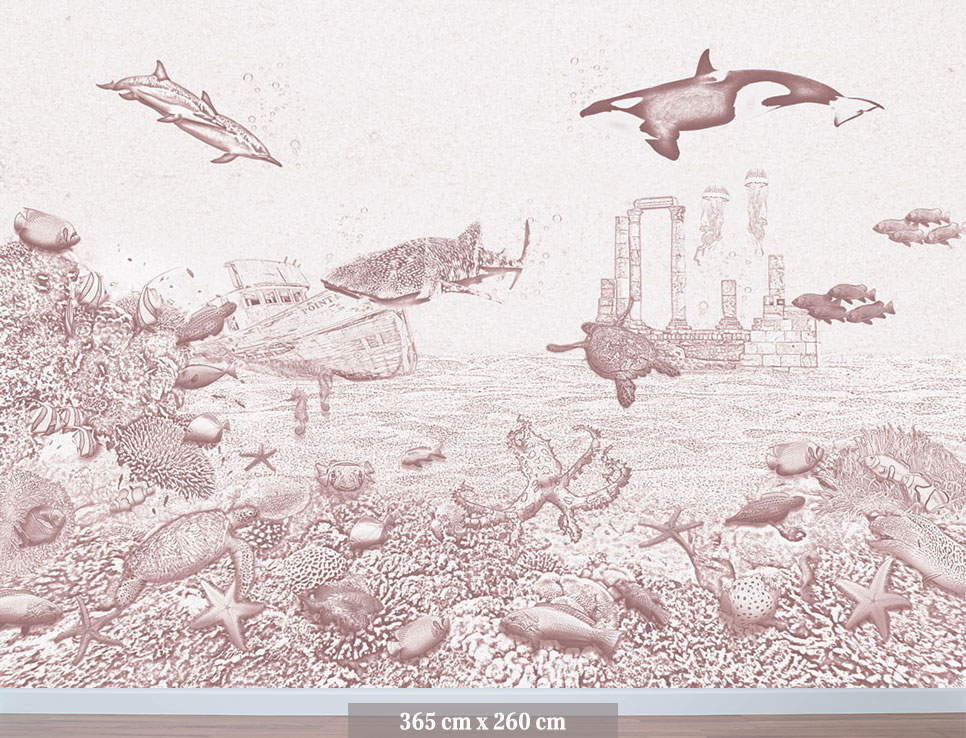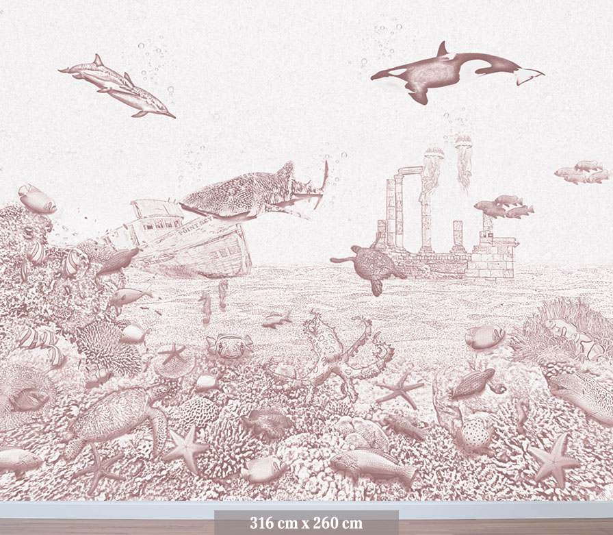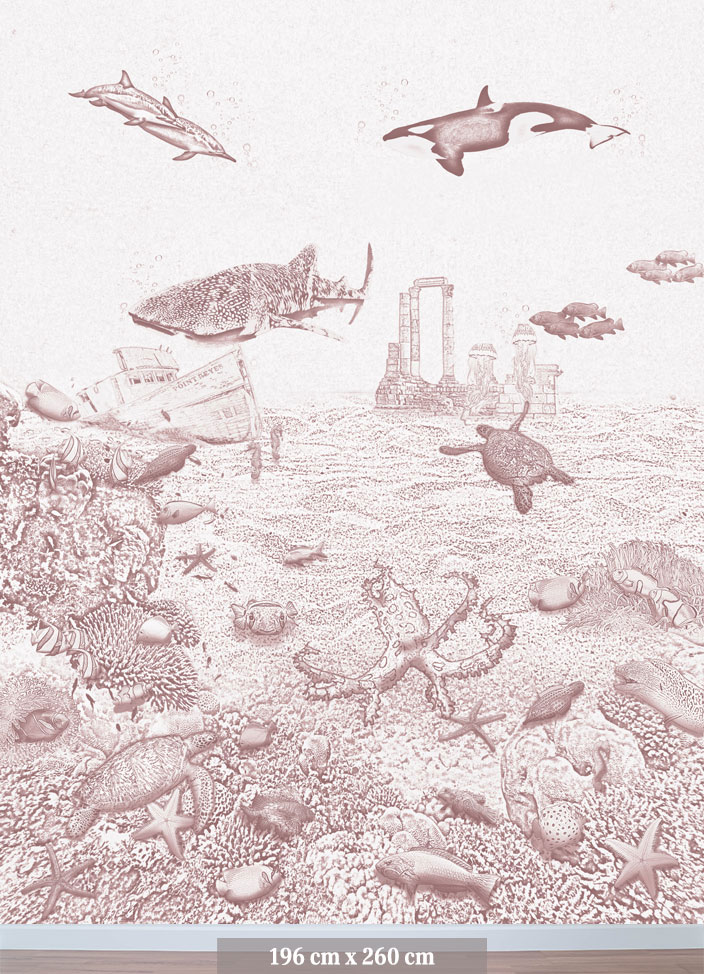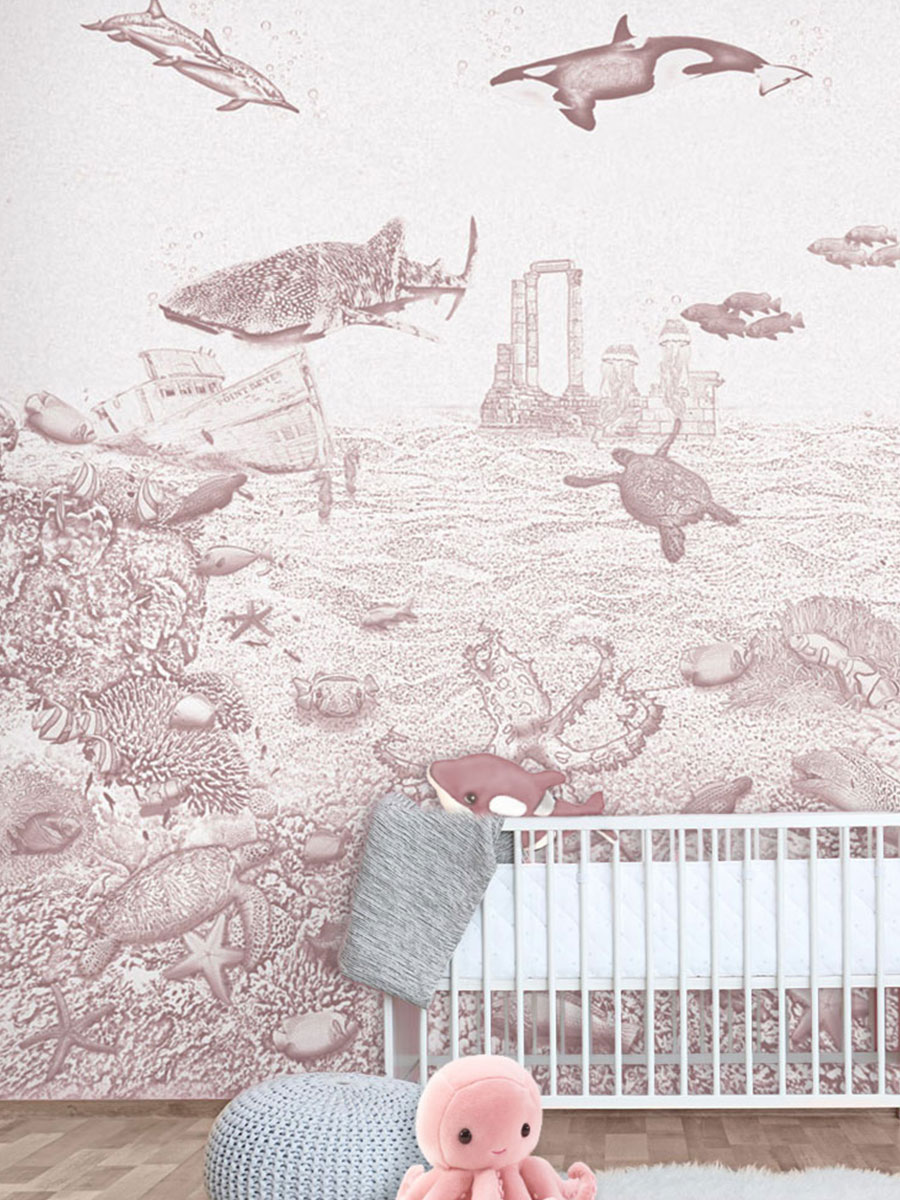 Het zeedieren behang orka van Moodies verandert de meisjes babykamer of kinderkamer in een levendige onderwaterwereld. De zacht oudroze krijtkleur vormt een rustige en warme basis voor een oceaan wereld vol sierlijke visjes. Een meisjes behang dat uitnodigt tot dromen, spelen en ontspannen. Het koraal is gevuld met anemoonvissen, keizersvissen, een octopus en zelfs een nieuwsgierige aal. De orka, walvishaai en dolfijnen zwemmen in de verte voorbij, terwijl schildpadden en zeepaardjes hun weg zoeken door het water. Een roze behang met een sfeervolle achtergrond voor fantasie en ontdekking in elke meidenkamer.