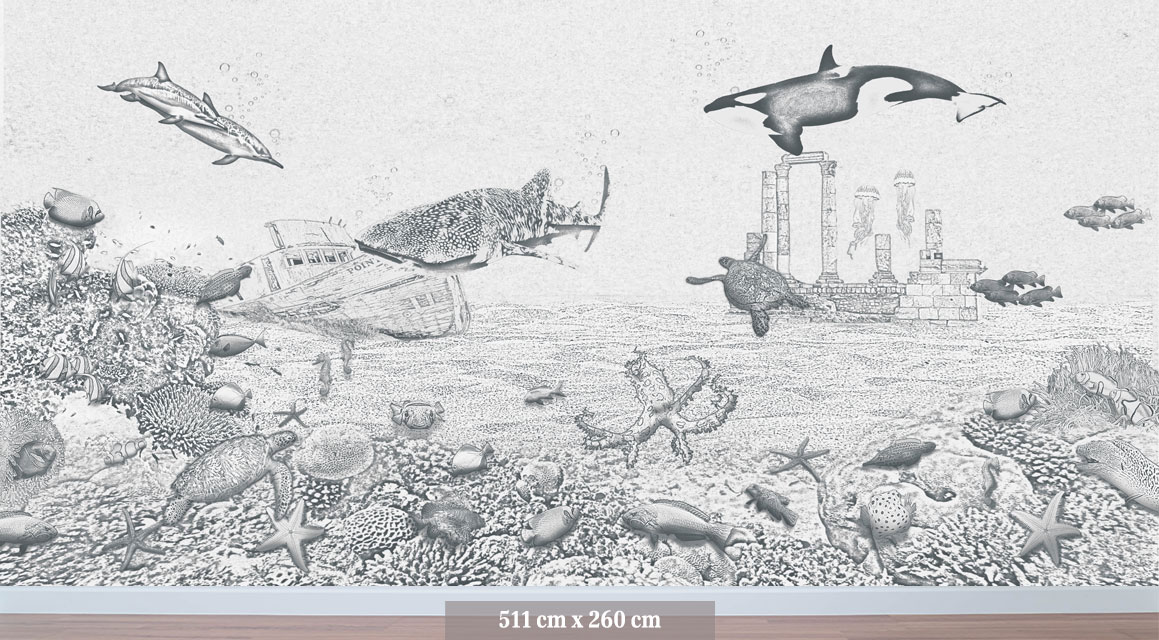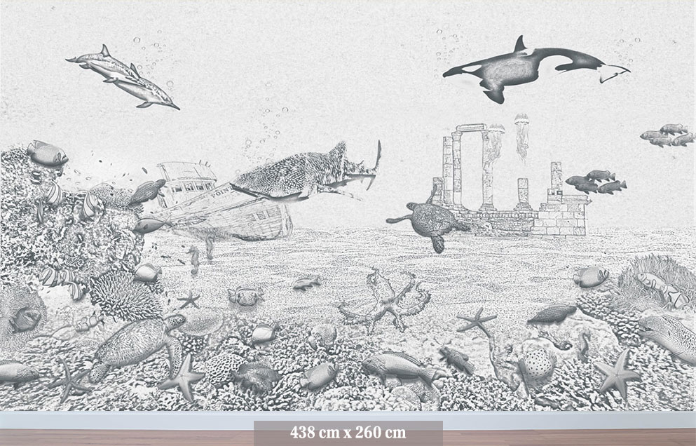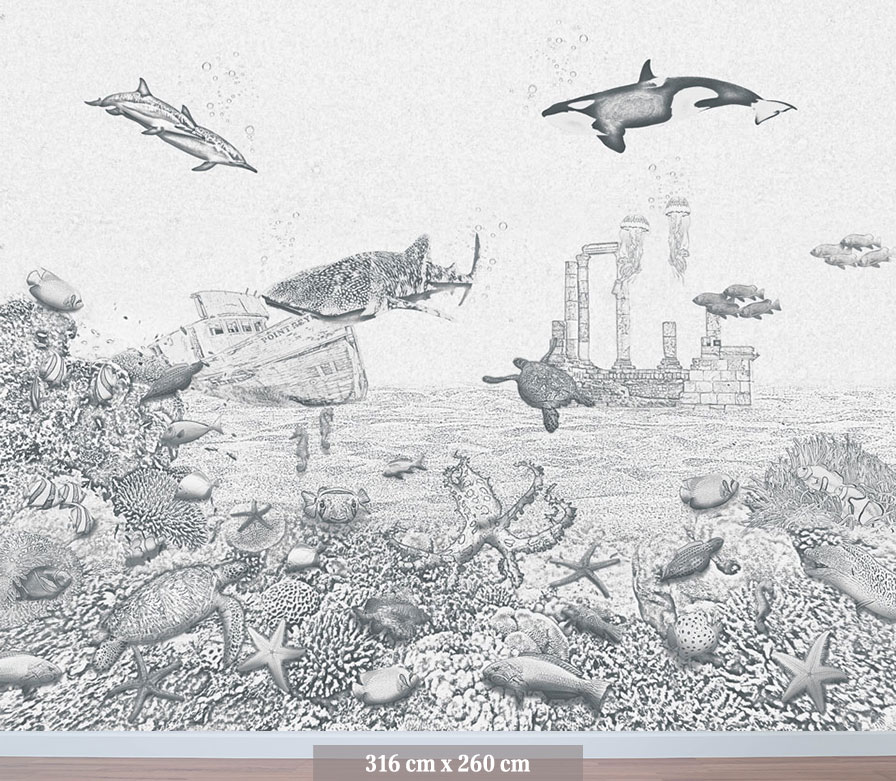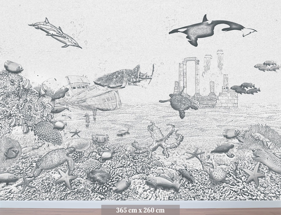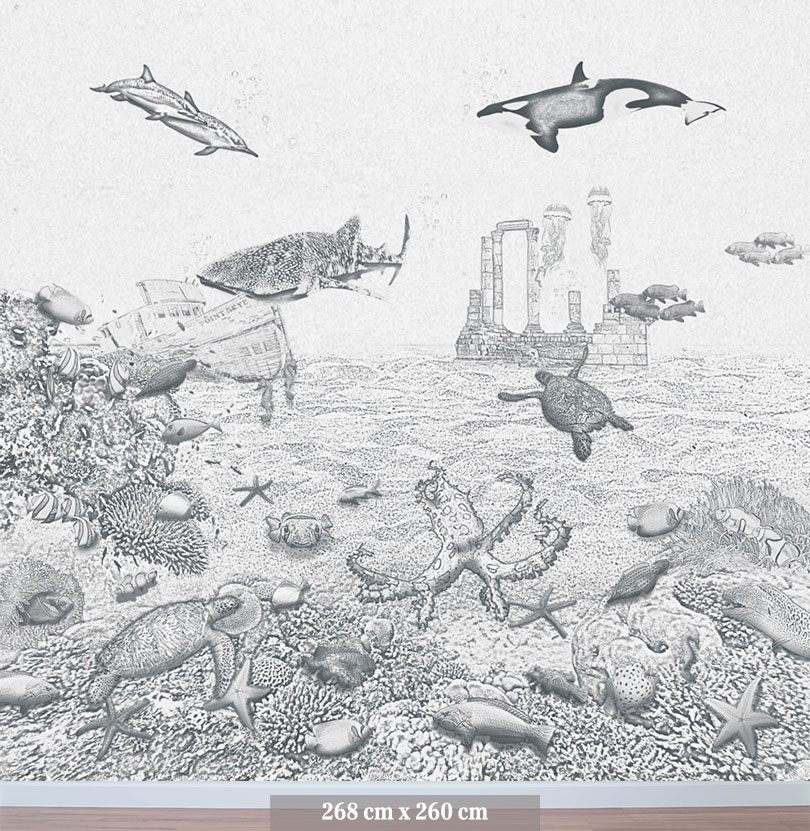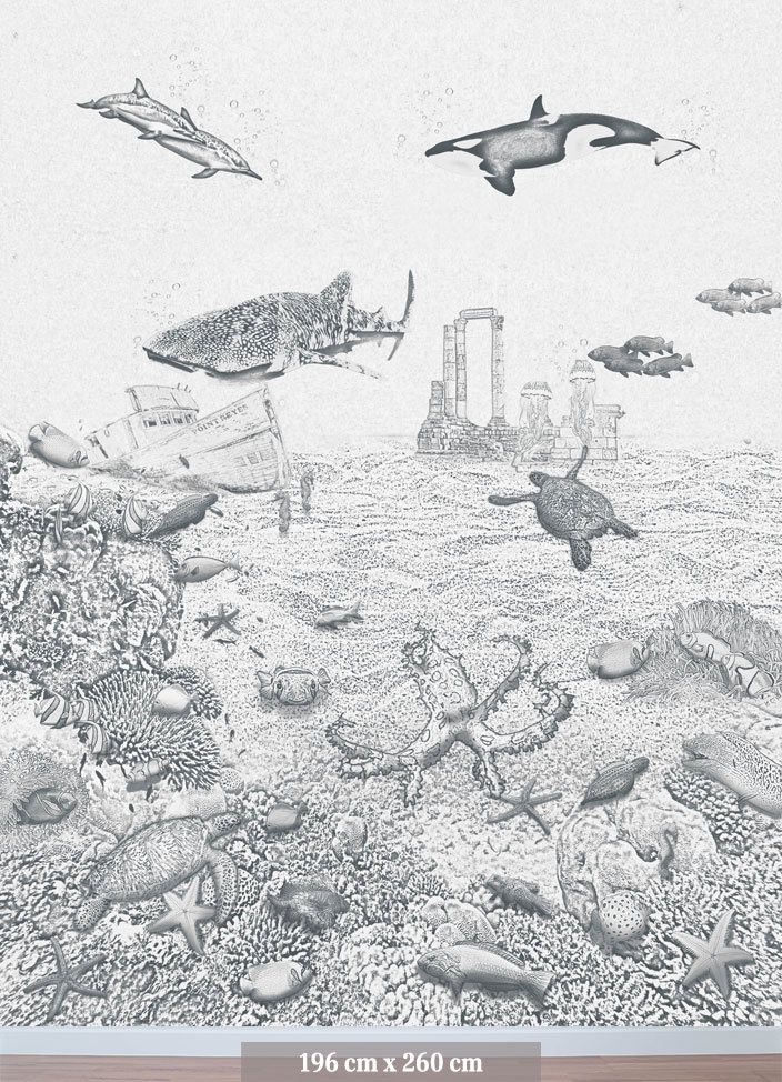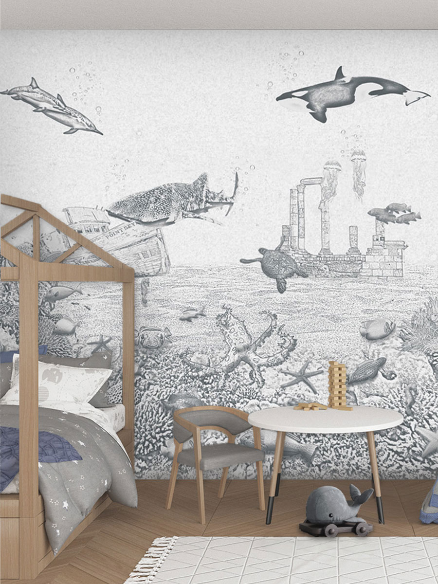 Het zeedieren behang orka van Moodies verandert de babykamer of kinderkamer in een levendige onderwaterwereld. De zacht potloodgrijze krijtkleur vormt een rustige en warme basis voor een oceaan wereld vol sierlijke visjes. Een neutraal behang dat uitnodigt tot dromen, spelen en ontspannen. Het koraal is gevuld met anemoonvissen, keizersvissen, een octopus en zelfs een nieuwsgierige aal. De orka, walvishaai en dolfijnen zwemmen in de verte voorbij, terwijl schildpadden en zeepaardjes hun weg zoeken door het water. Een grijs behang met een sfeervolle achtergrond voor fantasie en ontdekking, geschikt voor elke kinderkamer of babykamer.