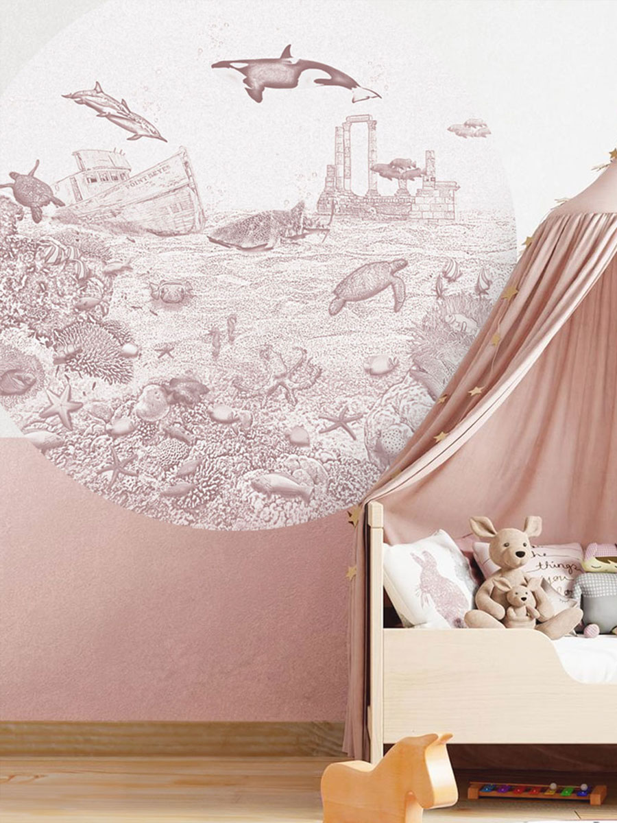 De zeedieren behangcirkel orka van Moodies verandert de meisjes babykamer of kinderkamer in een levendige onderwaterwereld. De zacht oudroze krijtkleur vormt een rustige en warme basis voor een oceaan wereld vol sierlijke visjes. Een meisjes behangcirkel dat uitnodigt tot dromen, spelen en ontspannen. Het koraal is gevuld met anemoonvissen, keizersvissen, een octopus en zelfs een nieuwsgierige aal. De orka, walvishaai en dolfijnen zwemmen in de verte voorbij, terwijl schildpadden en zeepaardjes hun weg zoeken door het water. Een sfeervolle achtergrond voor fantasie en ontdekking in elke meidenkamer.