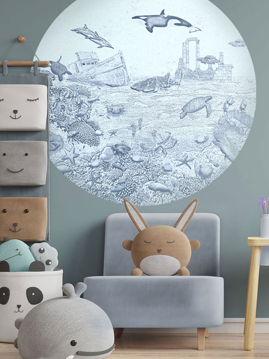 De zeedieren muursticker orka van Moodies verandert de jongens babykamer of kinderkamer in een levendige onderwaterwereld. De zacht zeeblauwe krijtkleur vormt een rustige en warme basis voor een oceaan wereld vol sierlijke visjes. Een jongens muursticker dat uitnodigt tot dromen, spelen en ontspannen. Het koraal is gevuld met anemoonvissen, keizersvissen, een octopus en zelfs een nieuwsgierige aal. De orka, walvishaai en dolfijnen zwemmen in de verte voorbij, terwijl schildpadden en zeepaardjes hun weg zoeken door het water. Een blauwe muursticker met een sfeervolle achtergrond voor fantasie en ontdekking in elke jongenskamer.